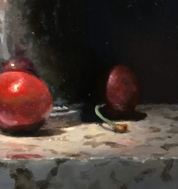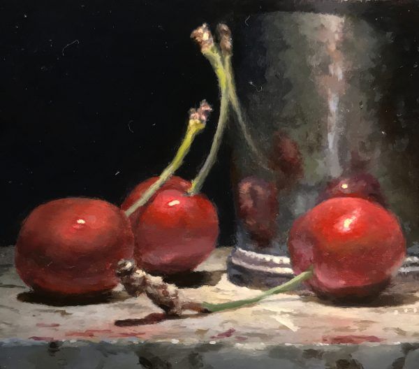 “Red Cherries, Silver Cup” is an original still life painting. It features fresh red cherries dramatically arranged around an antique silver drinking cup. Painted against a black background, it draws inspiration from classical Dutch still life painting.