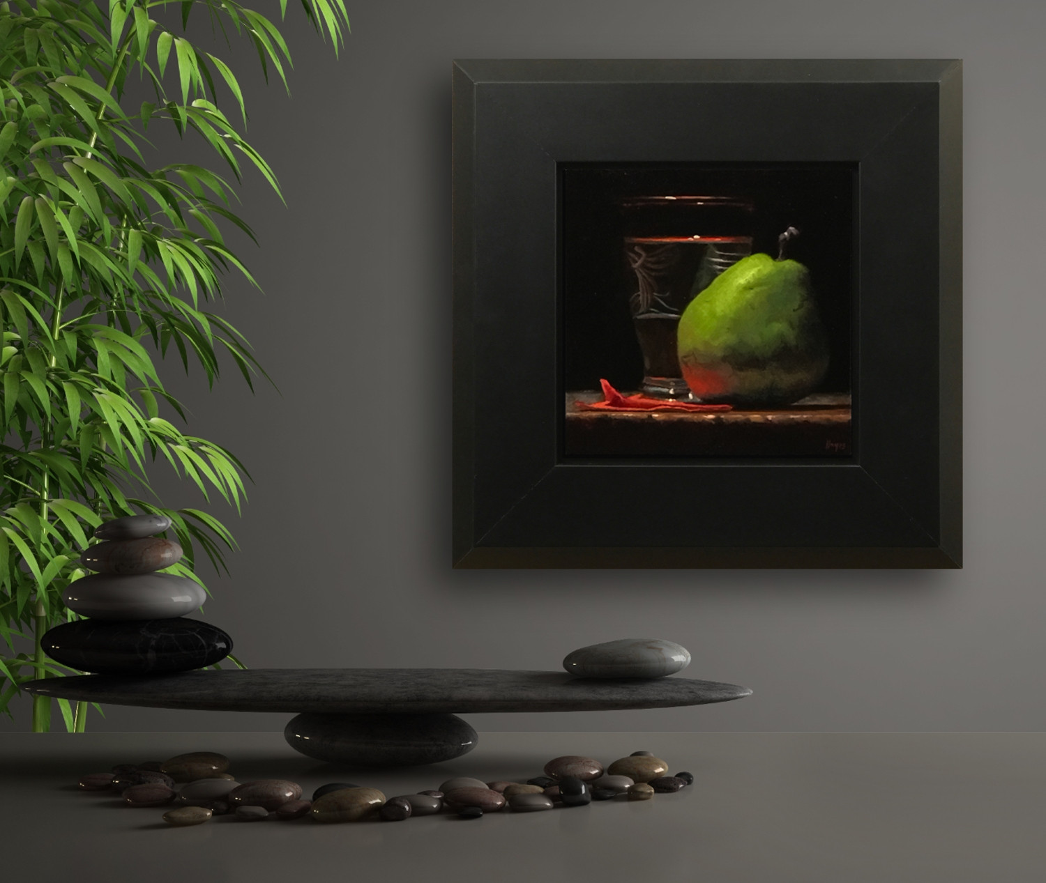 It features an antique cut crystal drinking glass, fresh pear, and a red napkin that creates a rich red reflection on the lower part of the fruit.