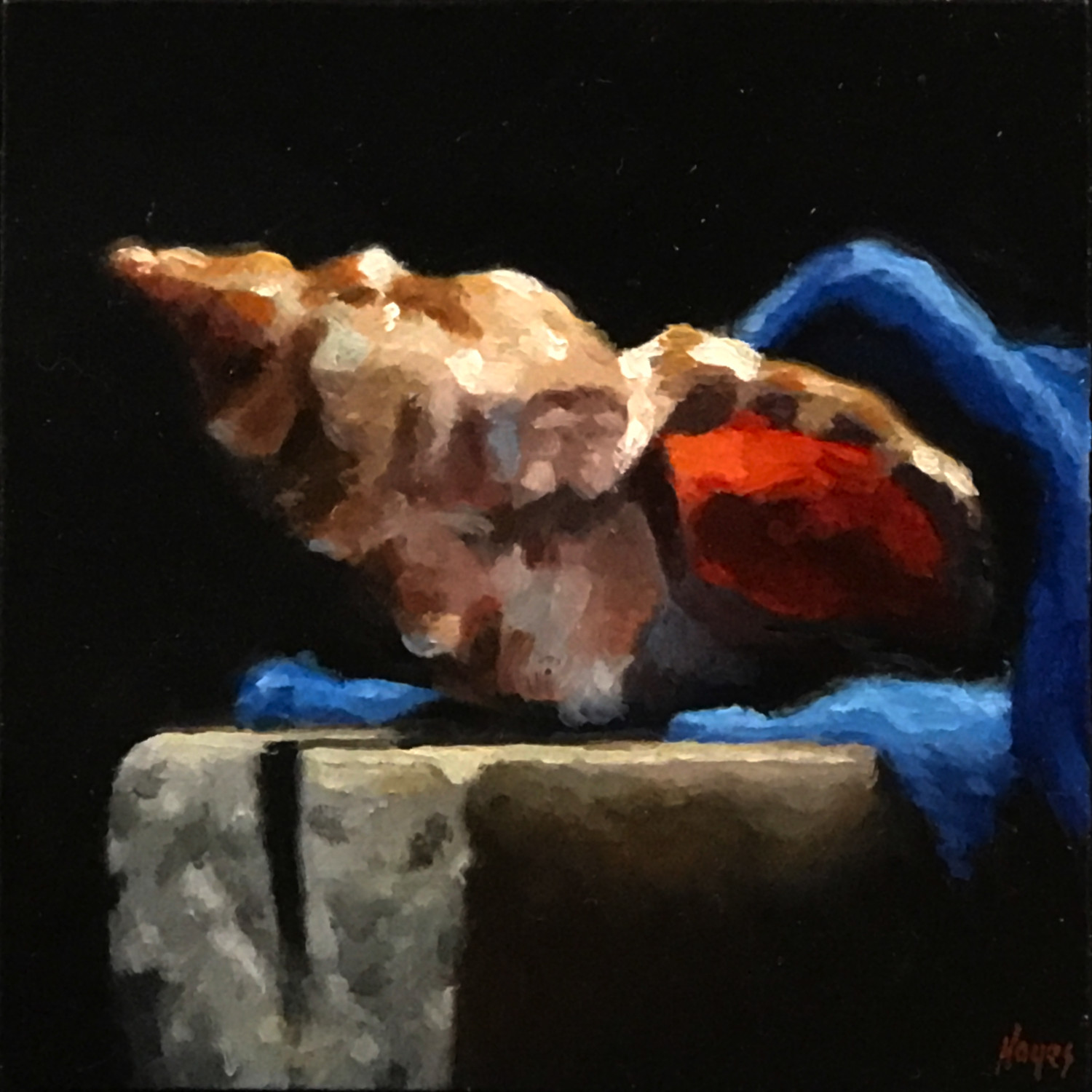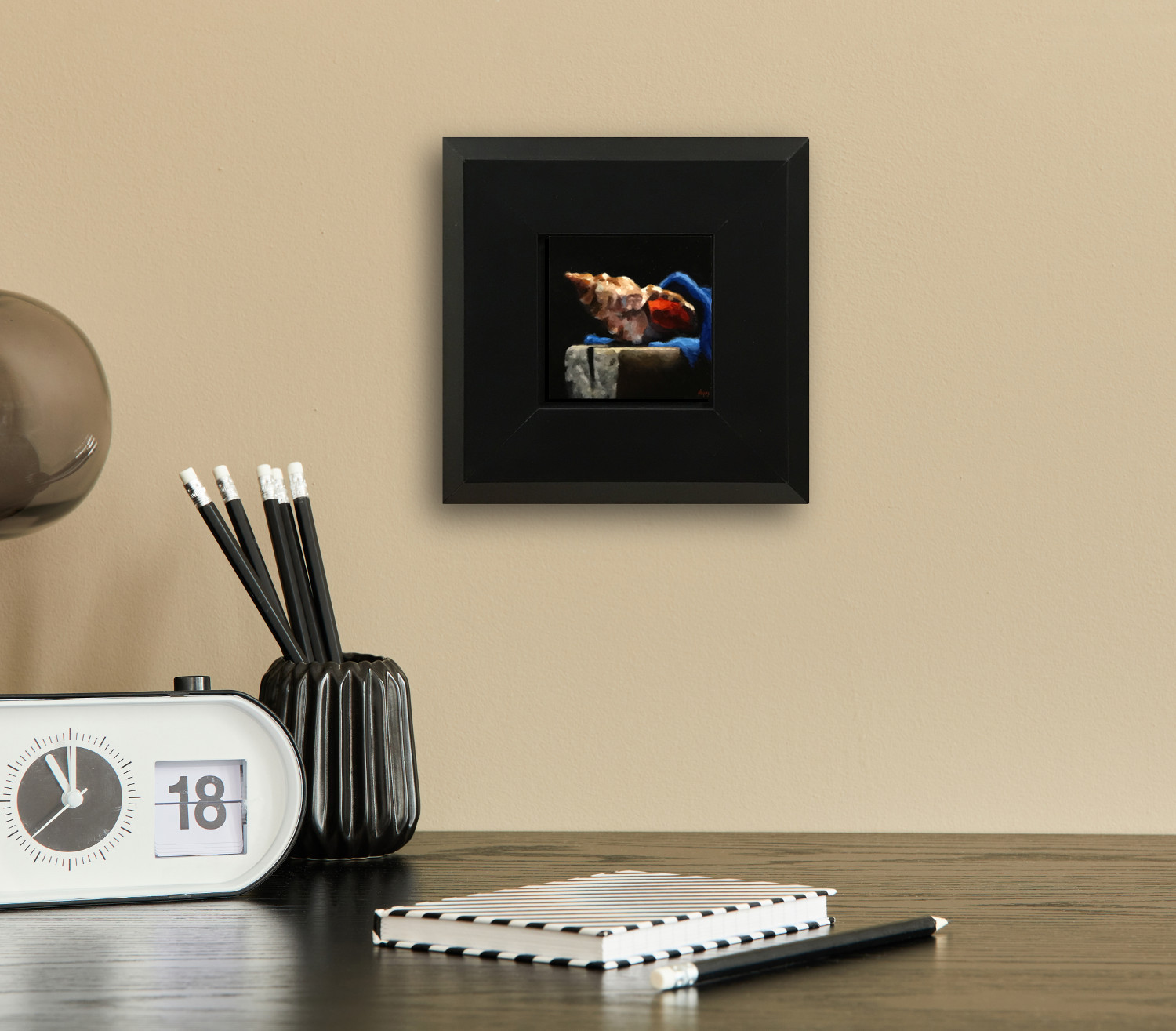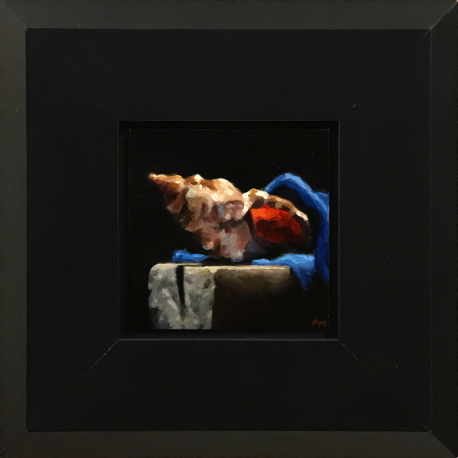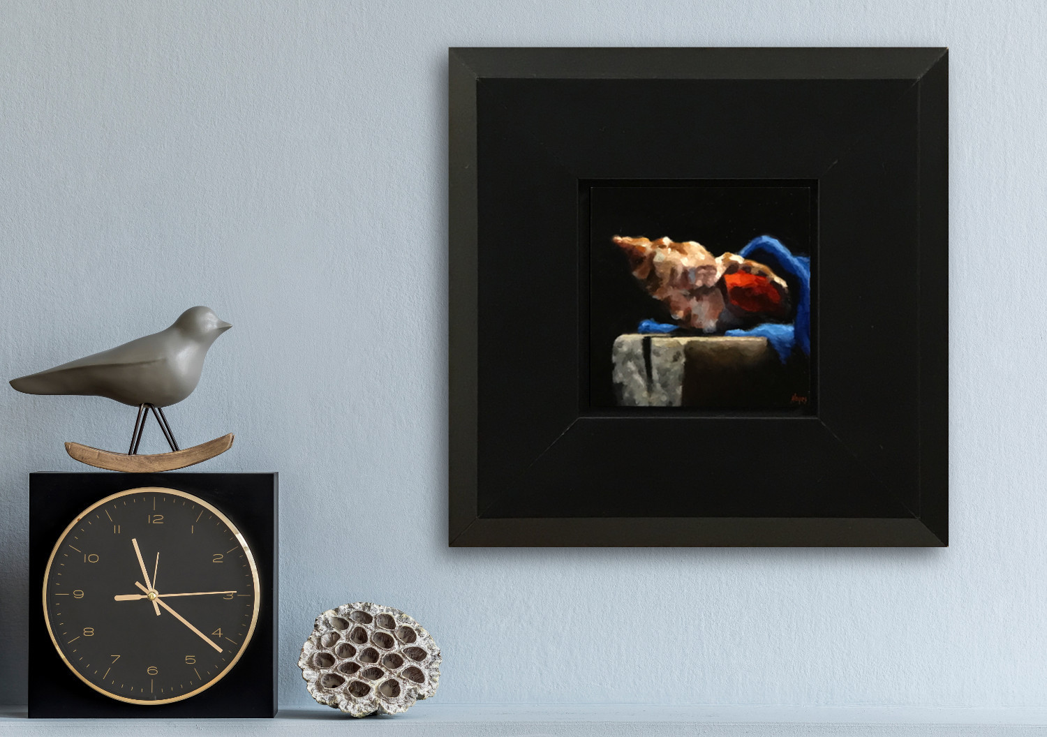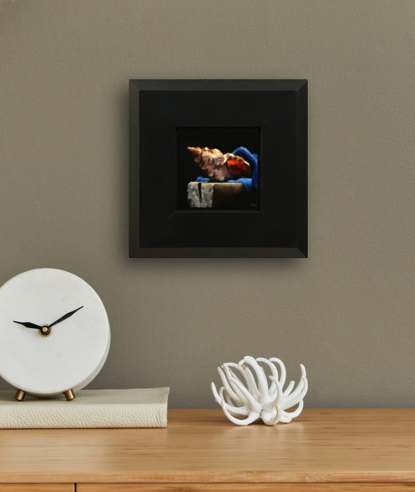 “Shell Study No. 1” is a 3×3-inch oil painting that captures the delicate beauty of a dramatic sea shell. Resting on a weathered marble shelf, the shell is emerges from flowing blue velvet, its intricate curves and translucent textures illuminated against a deep black background. The contrast of light and shadow enhances the richness of the materials, evoking a quiet sense of timeless elegance.