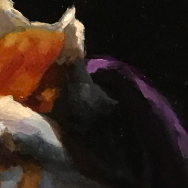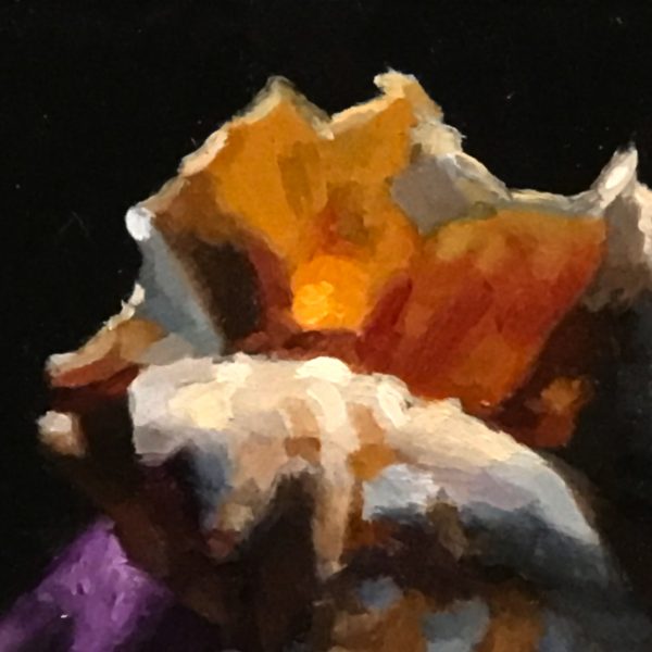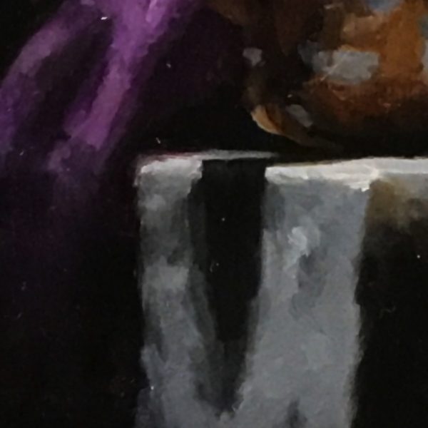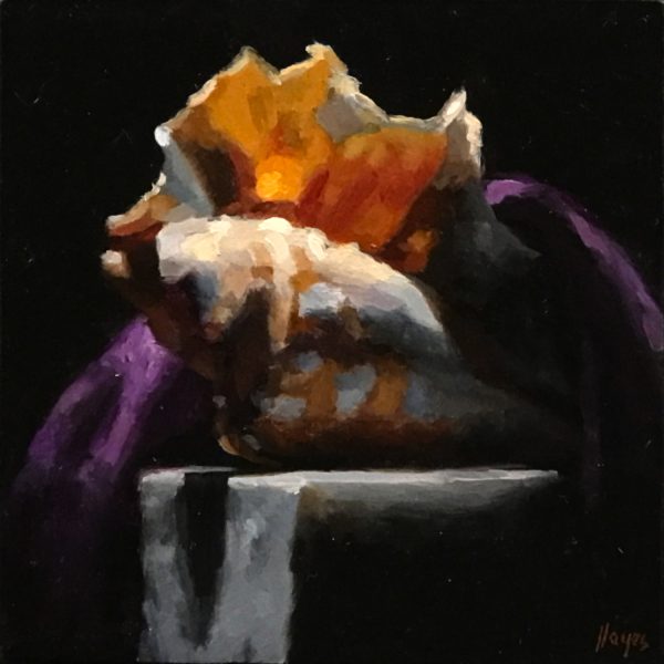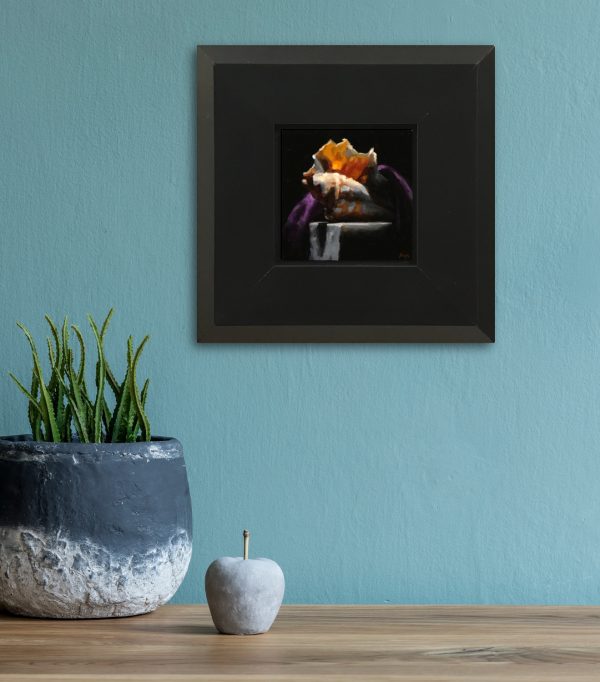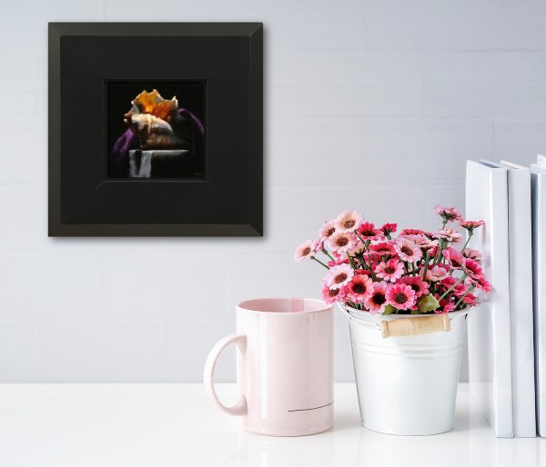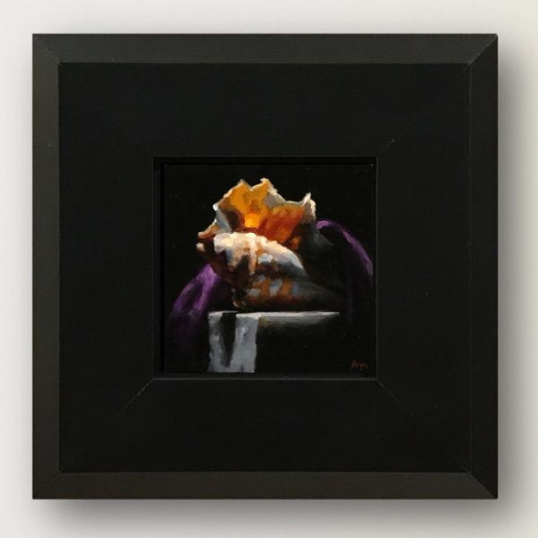 “Shell Study No. 2” is a 3×3-inch oil painting that captures the delicate beauty of a dramatic sea shell. Resting on a weathered marble shelf, the shell is partially draped in flowing purple velvet, its intricate curves and translucent textures illuminated against a deep black background. The contrast of light and shadow enhances the richness of the materials, evoking a quiet sense of timeless elegance.