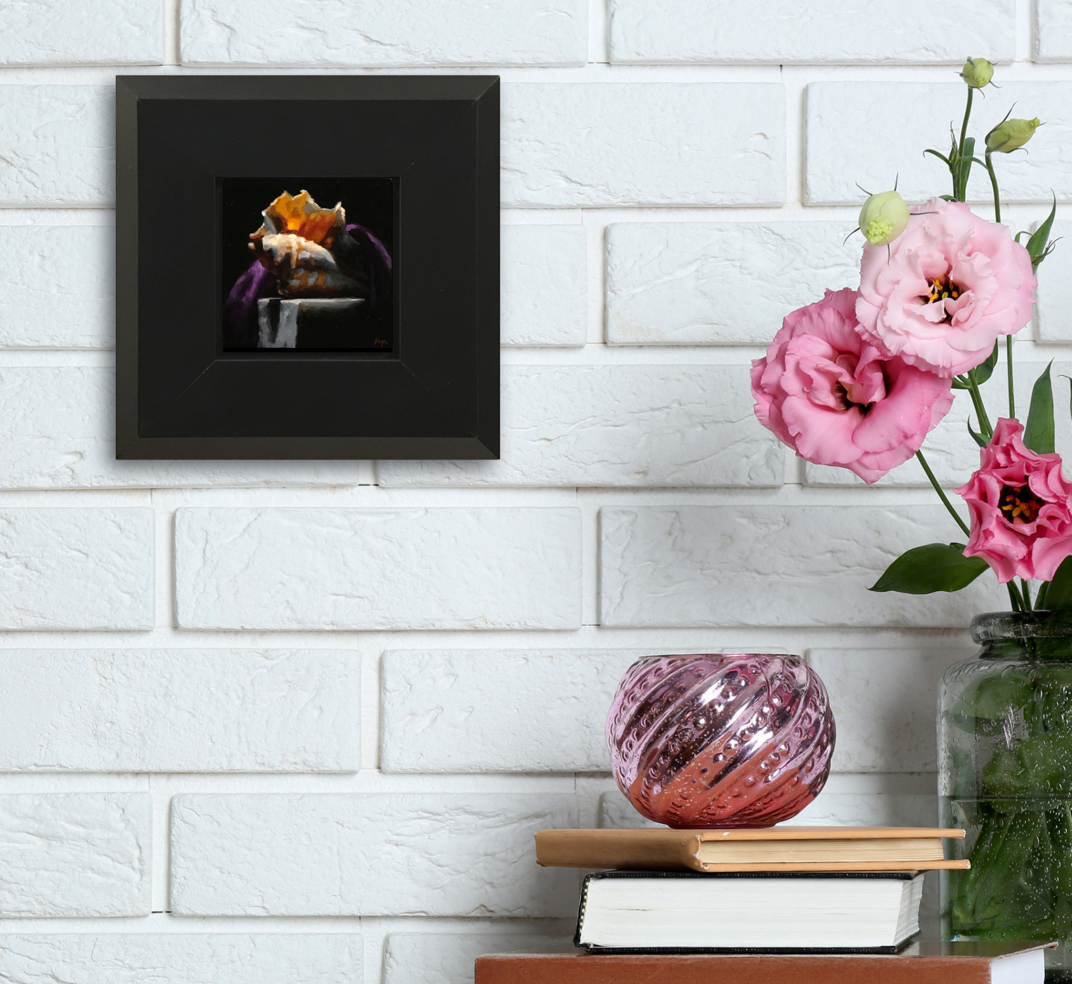 Framed in a classic black flat-panel frame with a beveled edge and mounted in a floating style, the painting’s 7×7-inch outer dimensions create a refined presentation that preserves every intricate detail. Ready to hang, it’s a perfect addition to a small space or a thoughtful gift for those who appreciate the beauty of nature.