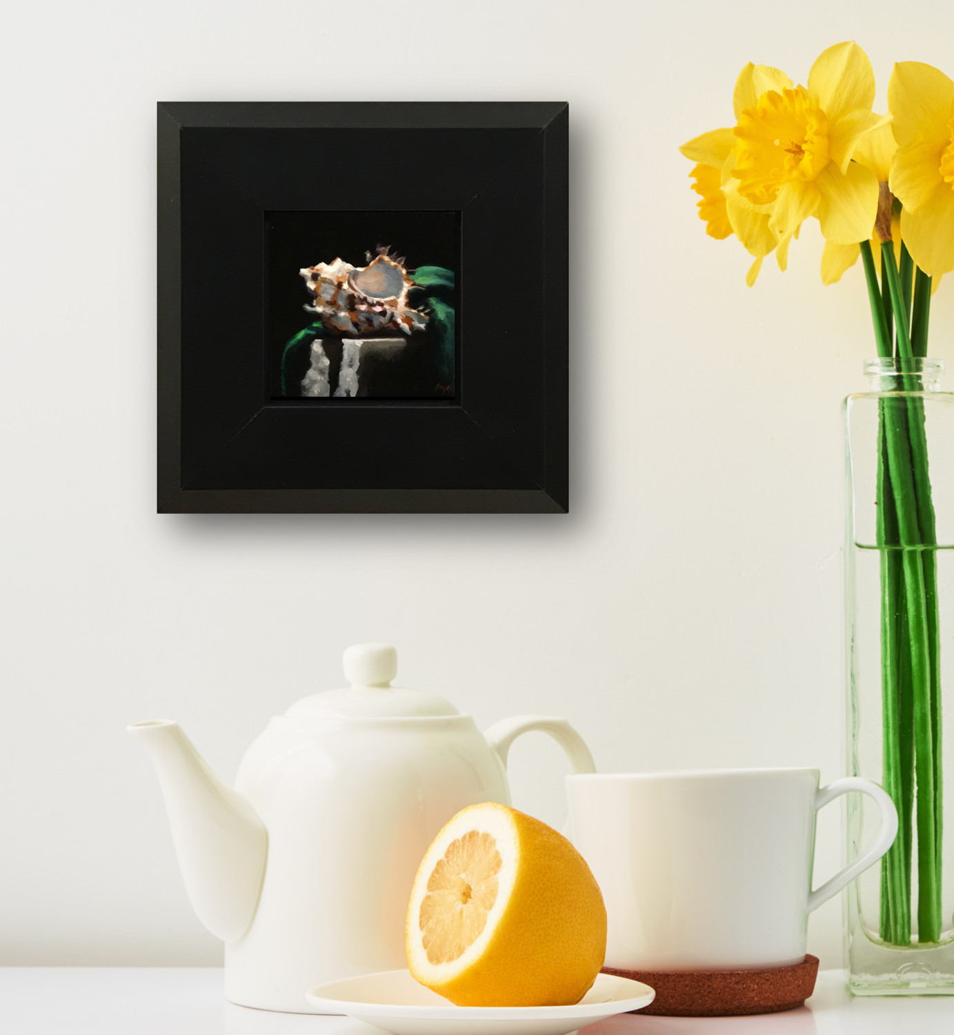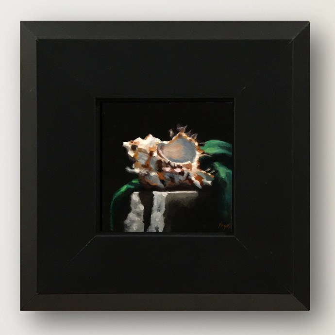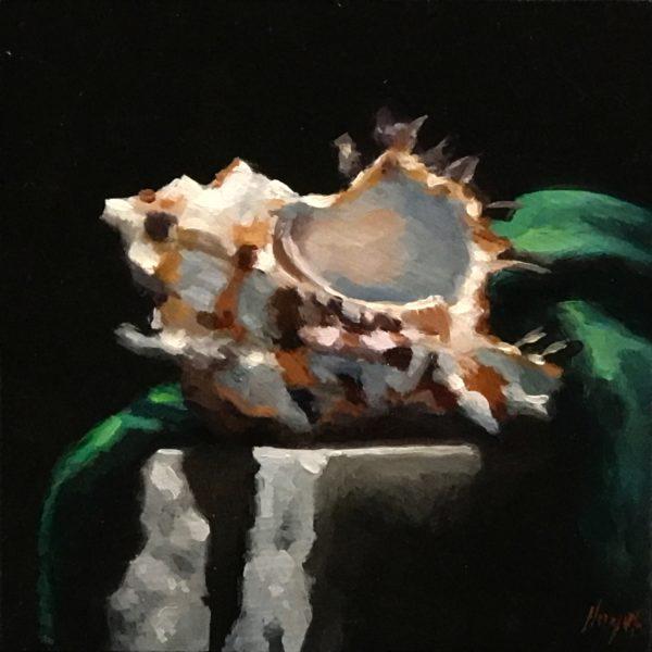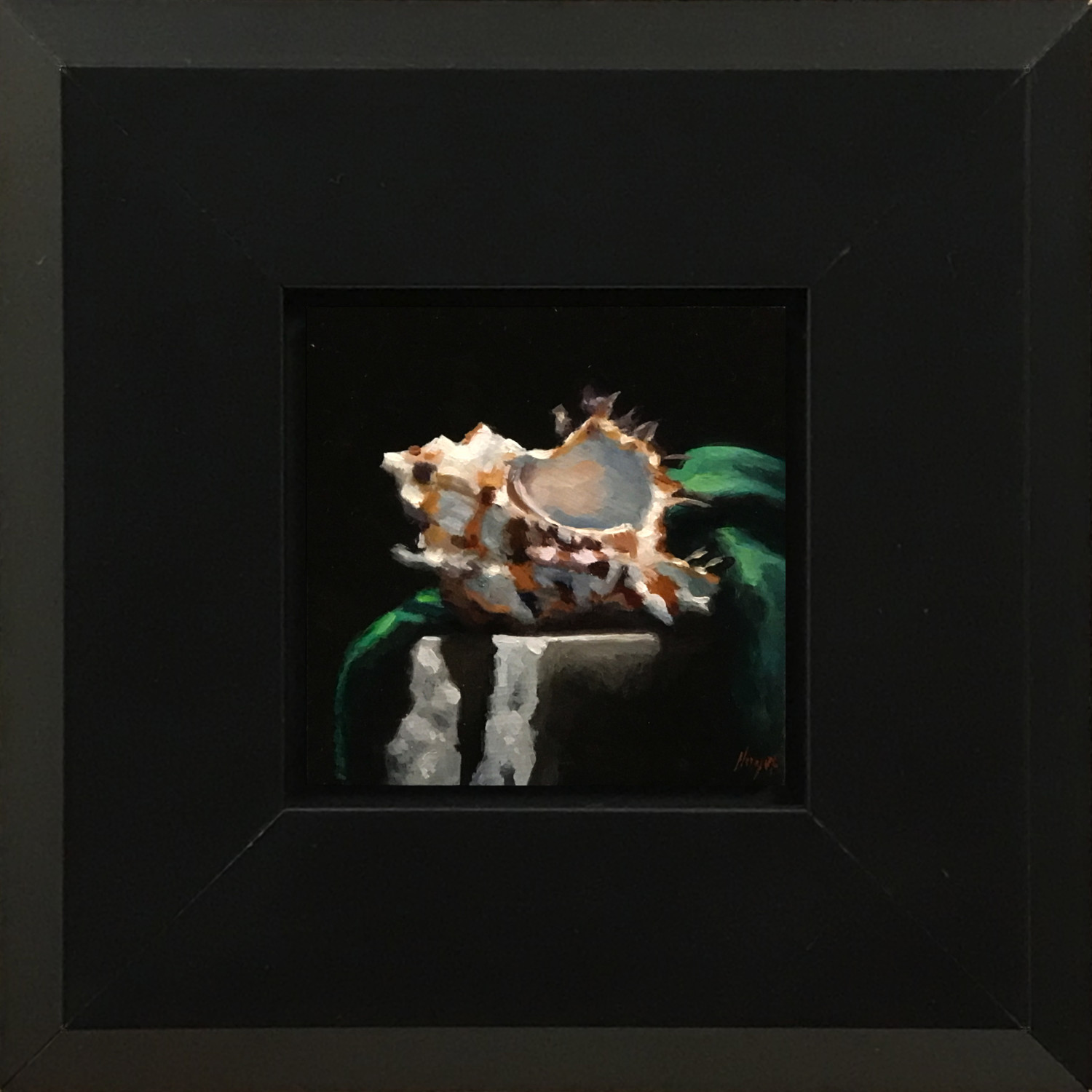 “Shell Study No. 3” is a 3×3-inch oil painting that captures the delicate beauty of a murex sea shell. Resting on a weathered marble shelf, the shell is partially draped in flowing green velvet, its intricate curves and textures illuminated against a deep black background. The contrast of light and shadow enhances the richness of the materials, evoking a quiet sense of timeless elegance.