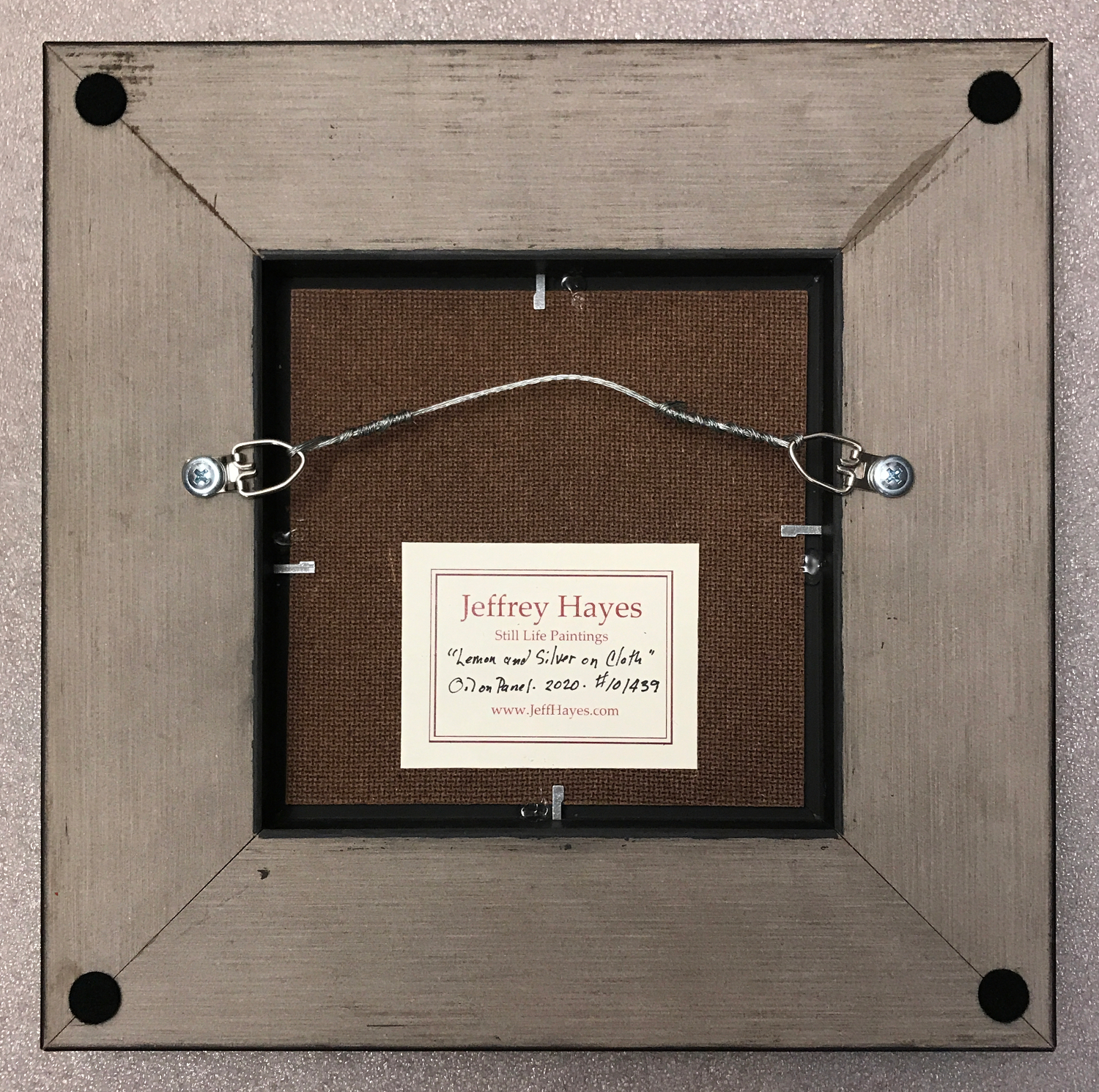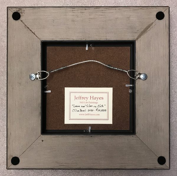 “Silver and Lemon on Cloth” measures 5 x 5 inches (12 x 12 cm), and is presented in a flat panel black frame with a beveled edge. The outer dimensions of the frame are 11 x 11 inches (28 x 28 cm). Felt pads are affixed to each corner of the back of the frame to prevent any damage to your wall and to ensure that the painting rests perfectly parallel to the wall.