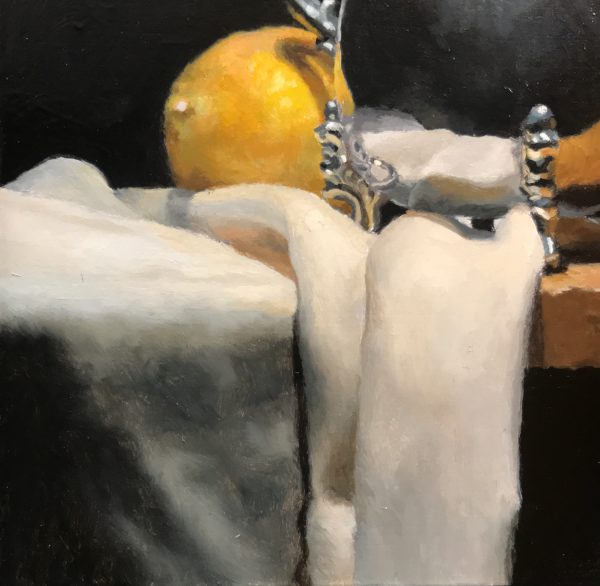 “Silver and Lemon on Cloth” is an original still life painting, done with oil on panel.