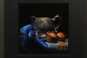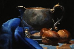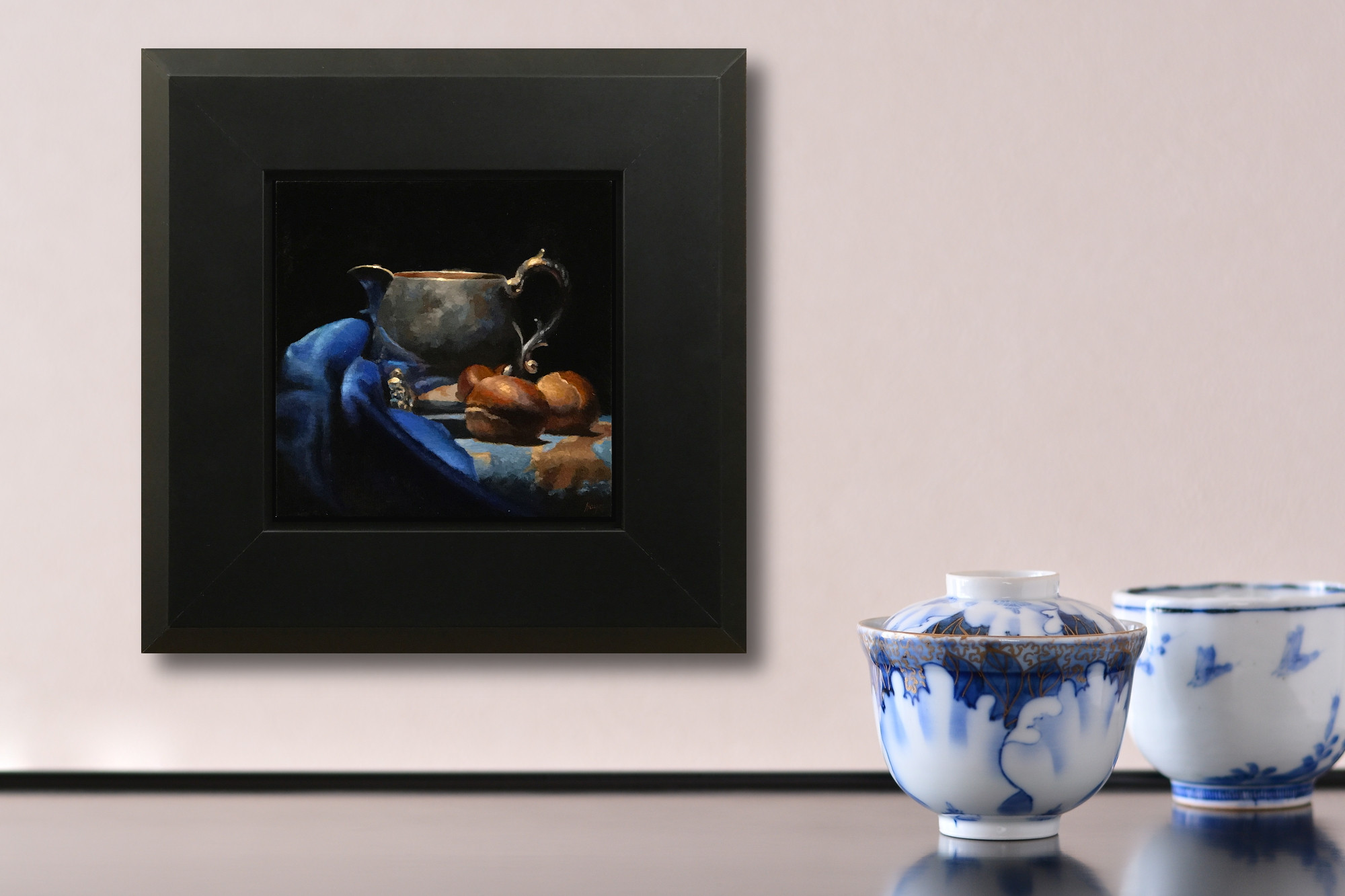 “Silver, Chestnuts, Velvet” is an original still life painting, done with oil on panel.