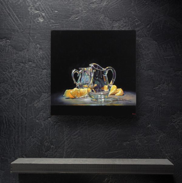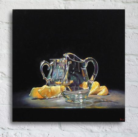 “Silver, Glass, Oranges” is an island of radiant light emerging from the deep darkness, creating a dramatic scene filled with brilliant highlights, sparkling reflections, and bursts of clear strong color.