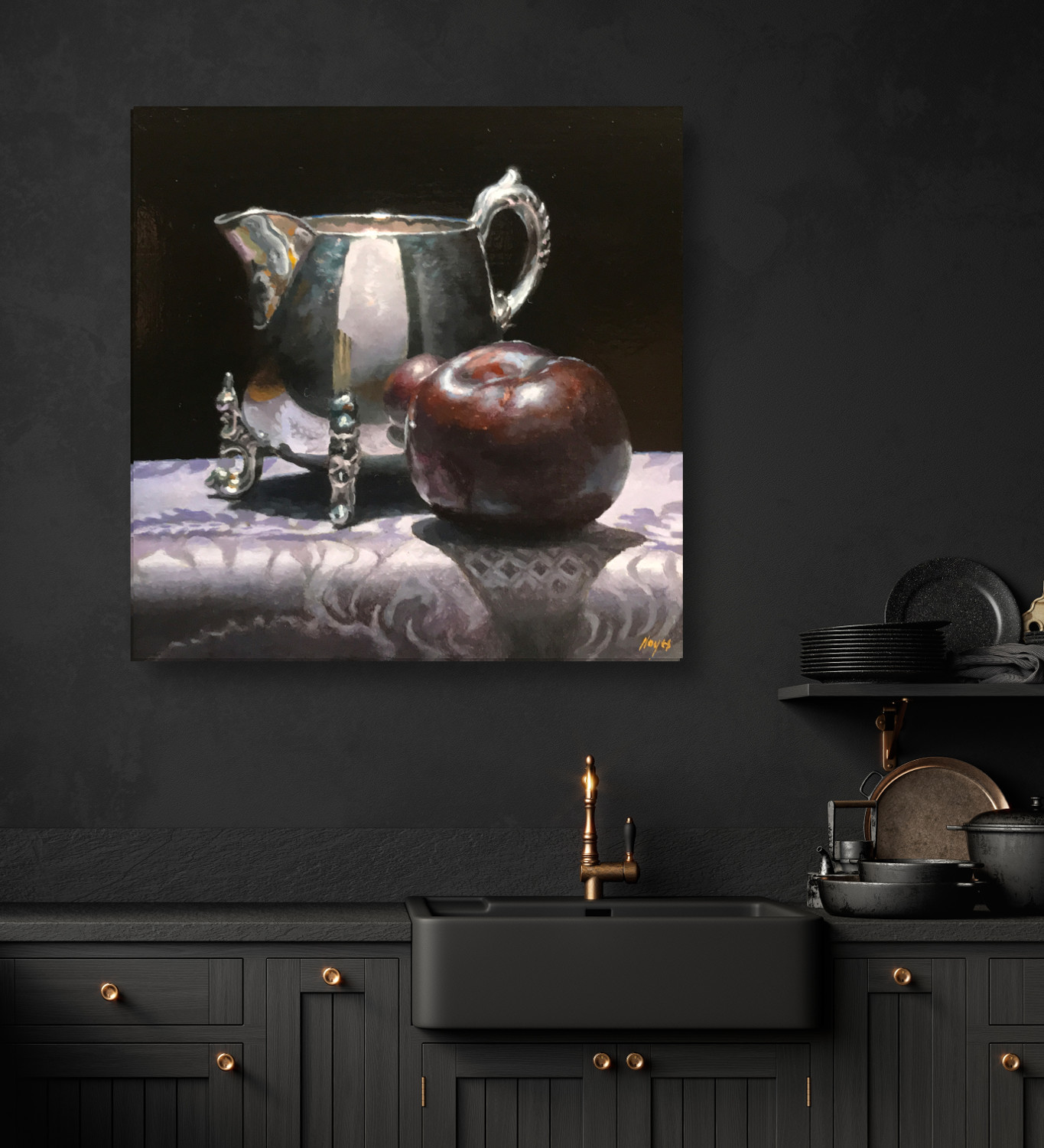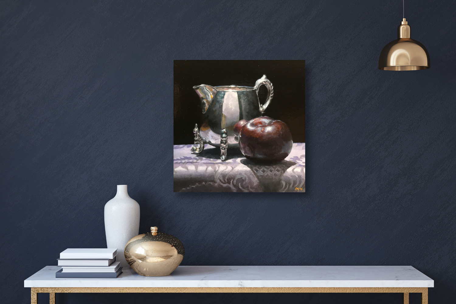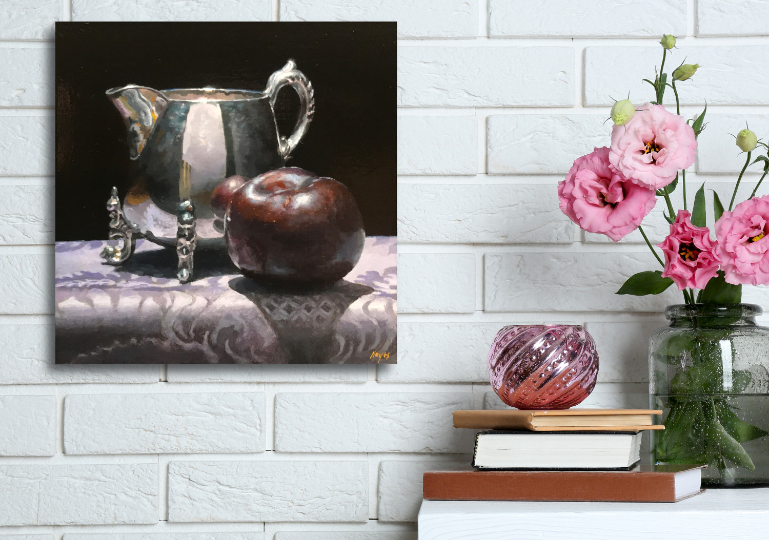 “Silver, Plum, Purple Silk” is a simple arrangement of an antique silver creamer and ripe plum resting on brocaded purple silk.