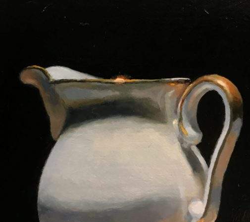 “Silver Spoon and Creamer” captures a perfectly still, silent moment of time; gentle light washes over an antique porcelain creamer and silver spoon, resting on a weathered wood plank.