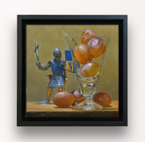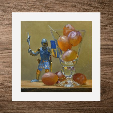 This surprising little drama features a small toy knight about to ambush his unsuspecting target – a glass filled with fresh ripe grapes.