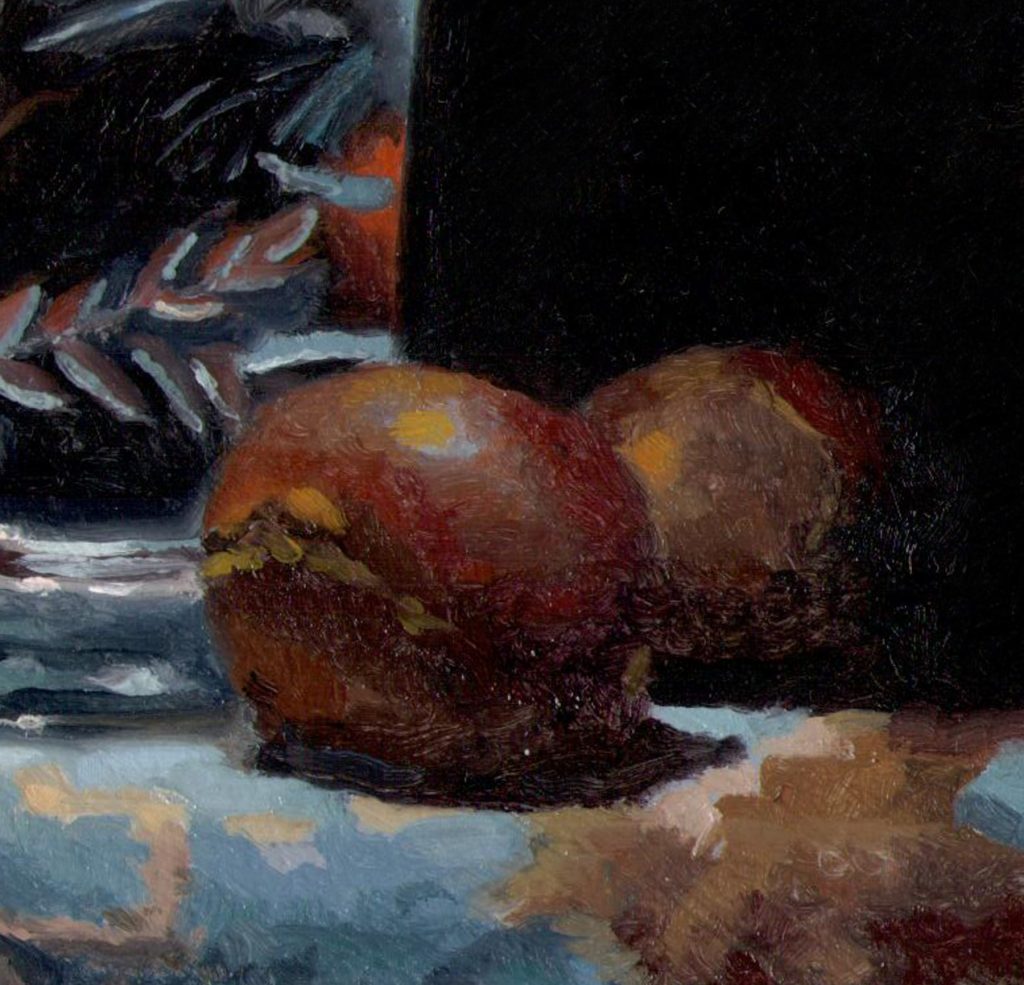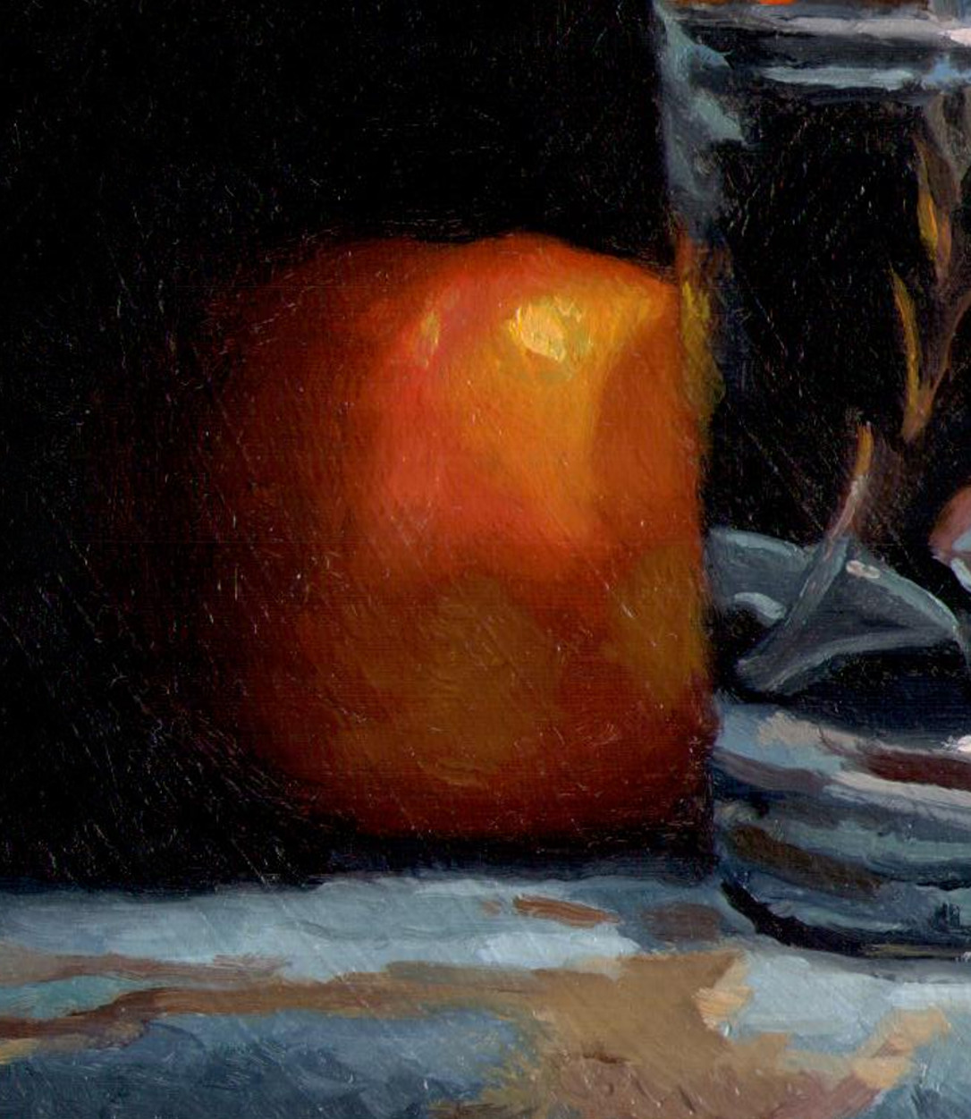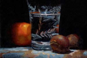 This painting is concerned with what happens when light meets surface. With how etched glass diffuses reflections into quiet patterns. With how fruit absorbs and releases color at different speeds. With how a simple arrangement can create an atmosphere of calm presence.