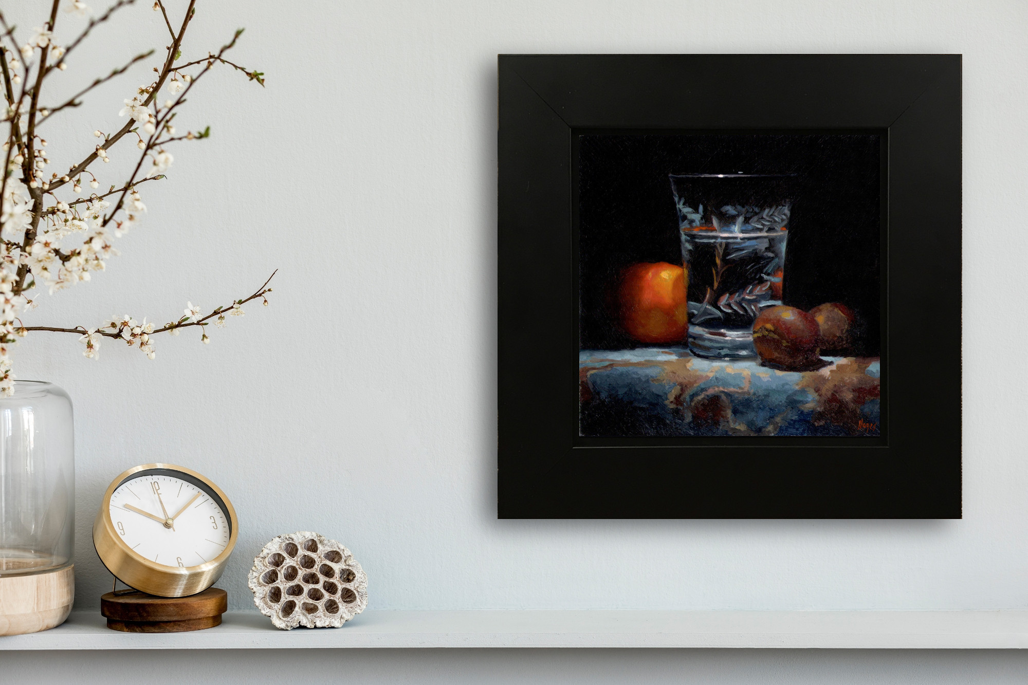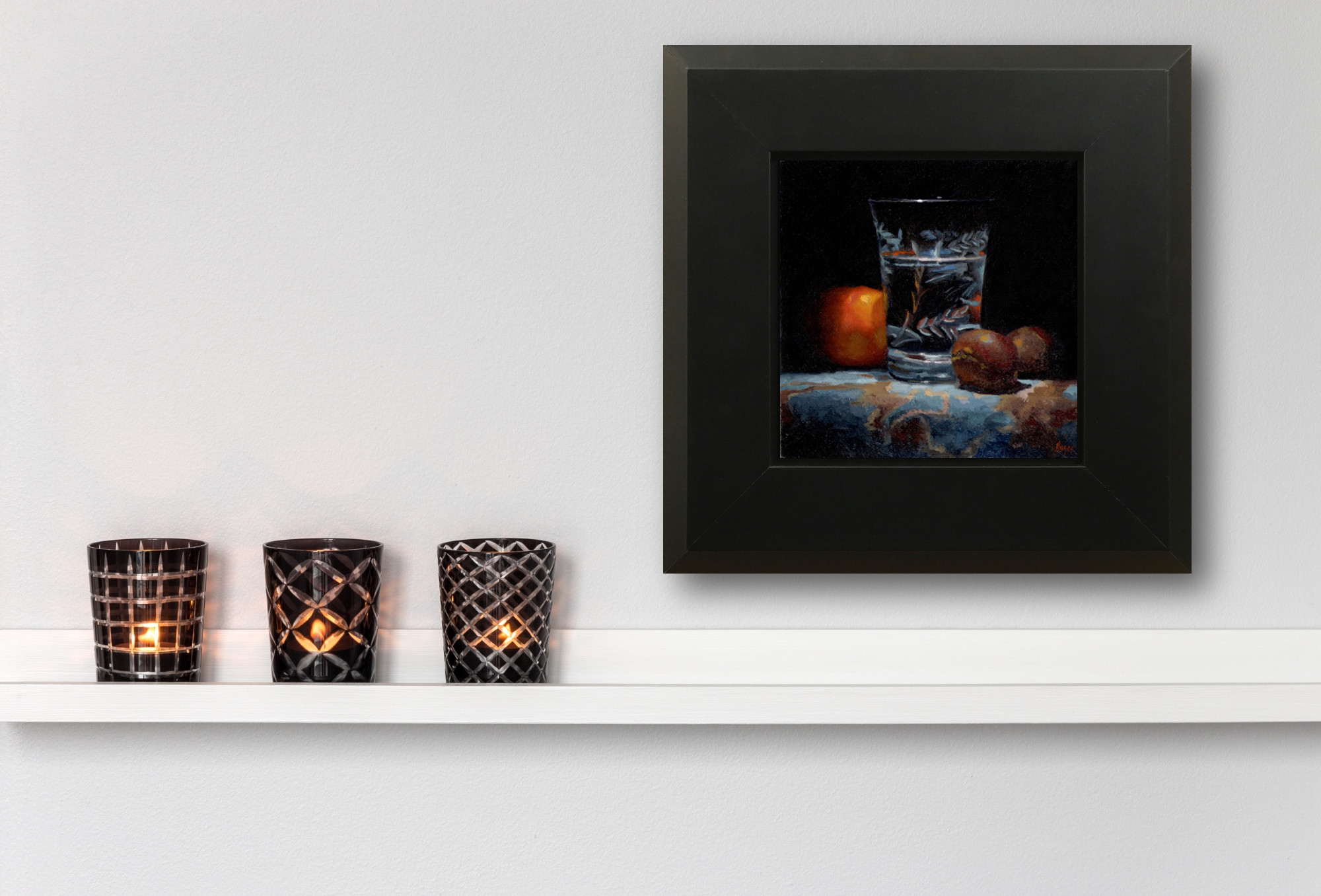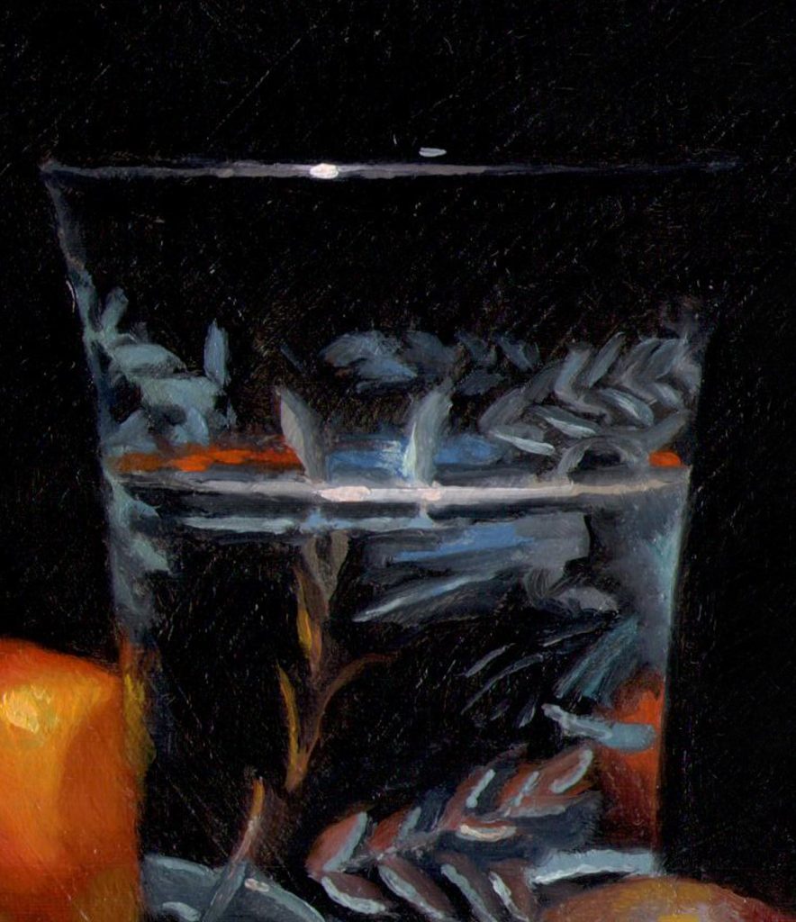 Only the finest oil paints were used in this work. The cool reflections within the glass are built from a restrained palette of mineral pigments, including subtle blues, grays, and transparent earth colors that allow the etched patterns to remain crisp and luminous. The warm citrus tones are shaped with natural pigments chosen for their richness and permanence, while the deeper hues of the chuestnuts come from carefully layered earth colors that bring forward their quiet presence.