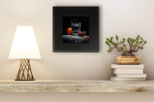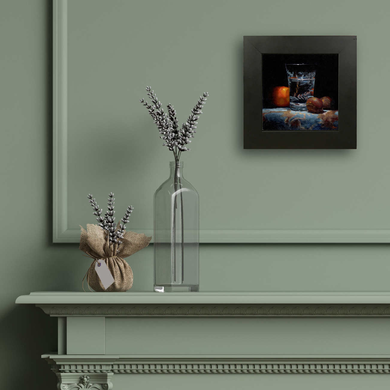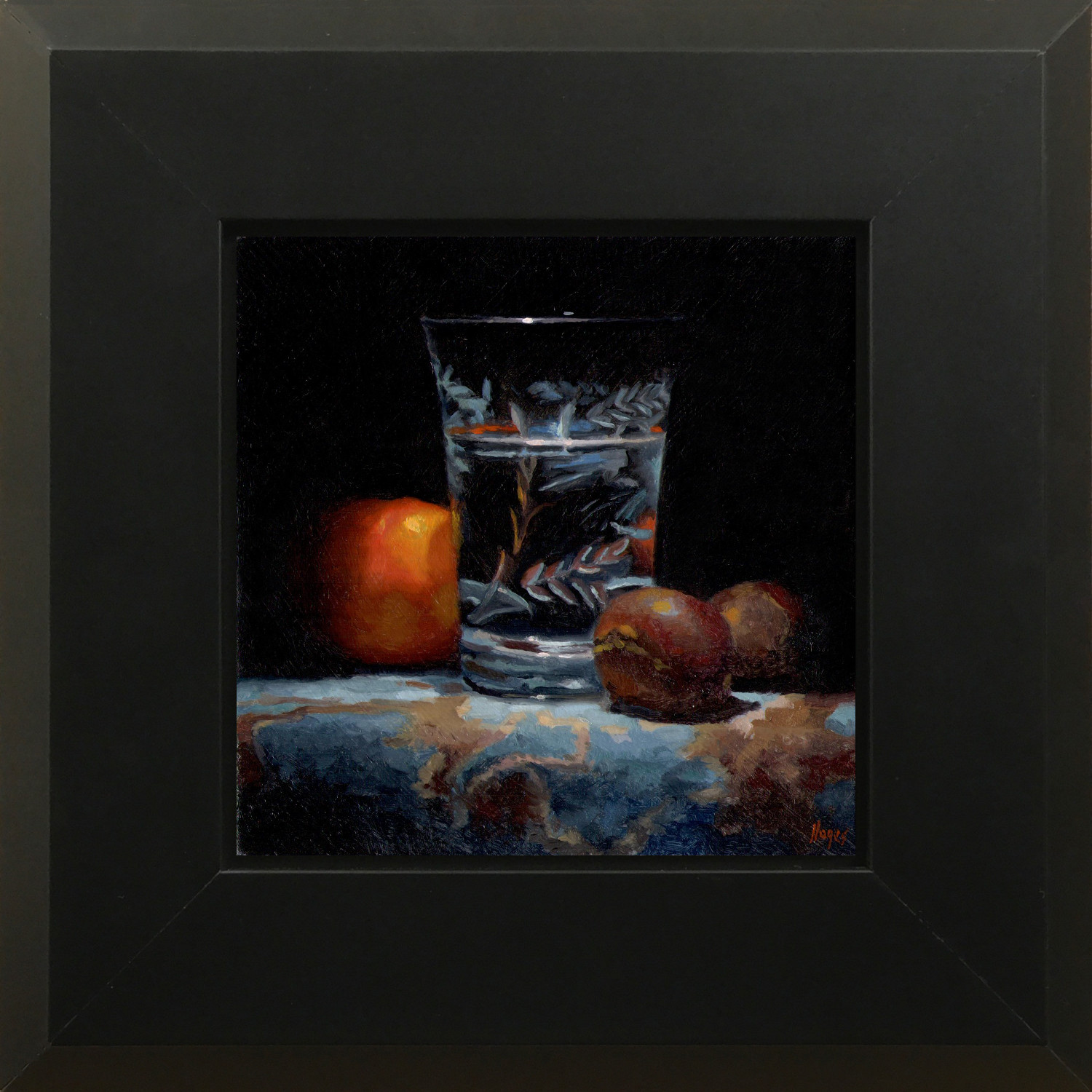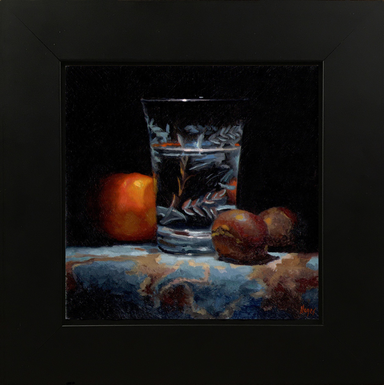 Only the finest oil paints were used in this work. The cool reflections within the glass are built from a restrained palette of mineral pigments, including subtle blues, grays, and transparent earth colors that allow the etched patterns to remain crisp and luminous. The warm citrus tones are shaped with natural pigments chosen for their richness and permanence, while the deeper hues of the chuestnuts come from carefully layered earth colors that bring forward their quiet presence.