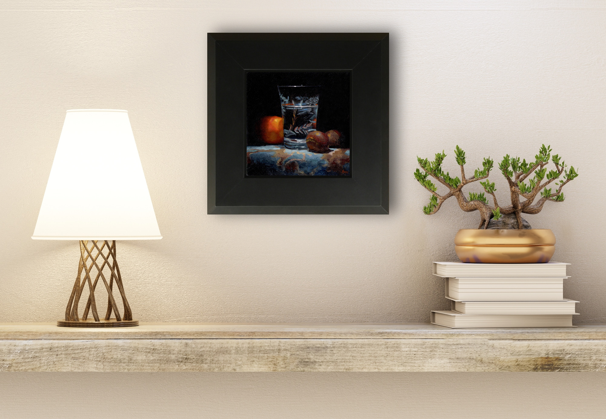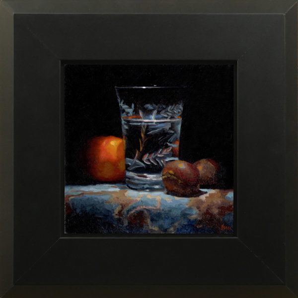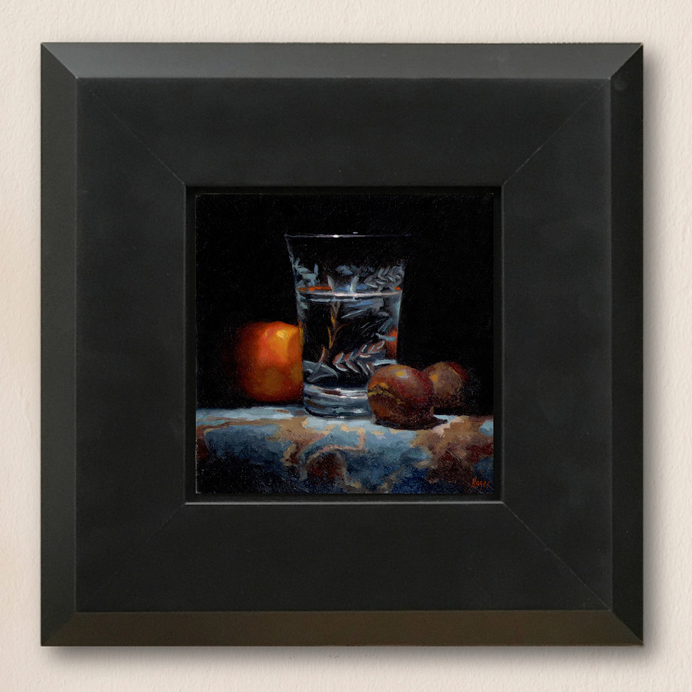 “Study in Silence with Etched Glass” was created through a traditional, layered painting process that has shaped still life practice for centuries. The arrangement was composed under controlled lighting to observe how illumination moves through water, reflects across etched glass, and settles into the surface of fruit and cloth.