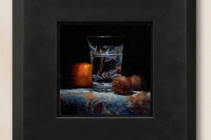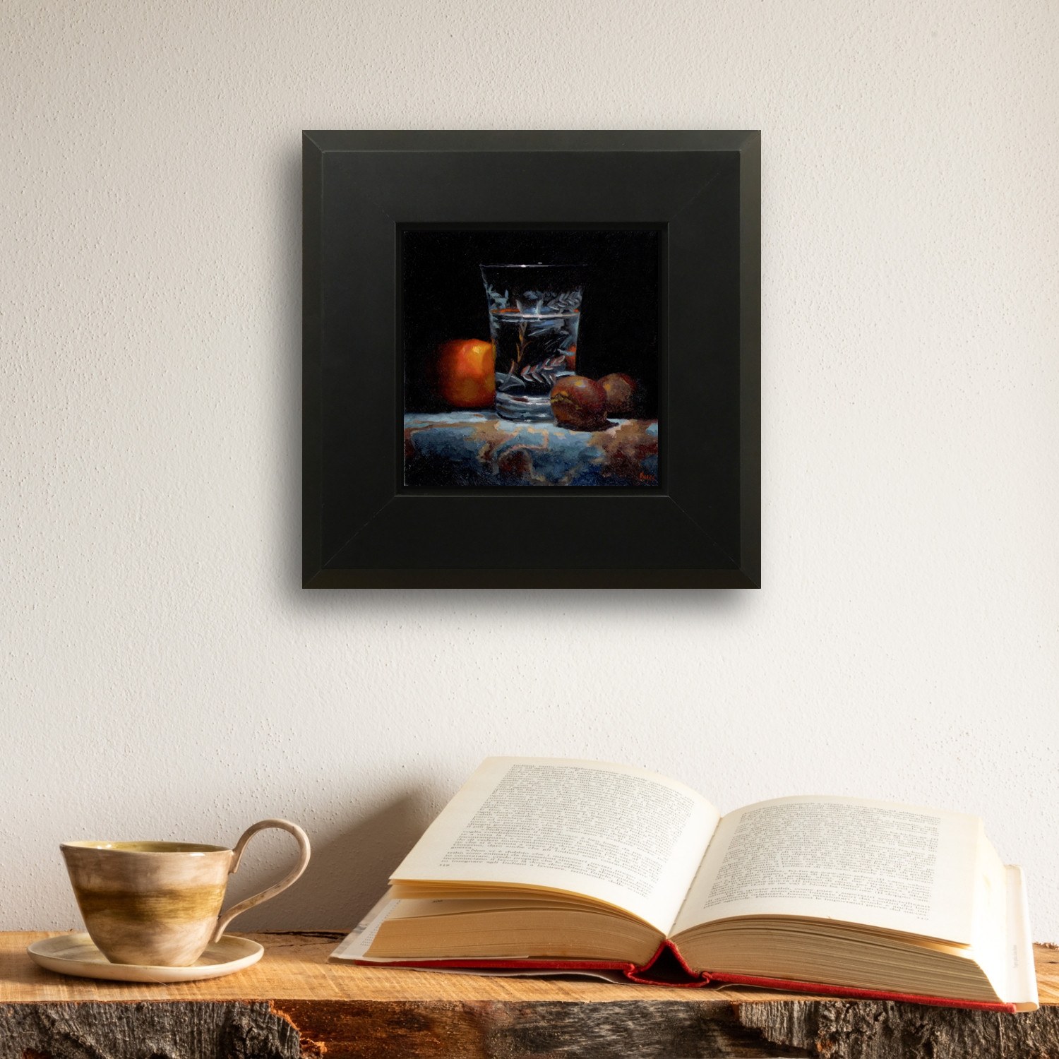 “Study in Silence with Etched Glass” measures 5 × 5 inches (13 × 13 cm) and is painted with oil on prepared panel, following time-tested traditional methods.
