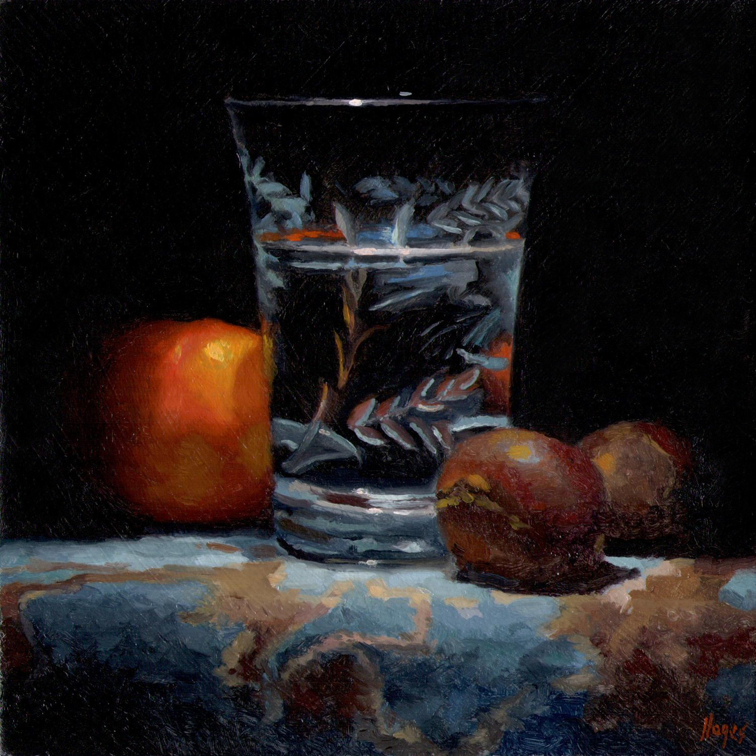 This painting follows that gentle transformation. The warm glow of the orange on the left becomes a muted echo inside the glass, its color pulled into elongated, wavering shapes. The two chestnuts to the right offer a quieter presence, their deep, earthy tones grounding the composition. The patterned cloth beneath them introduces a subtle complexity, its mottled colors repeating faintly within the glass and water.
