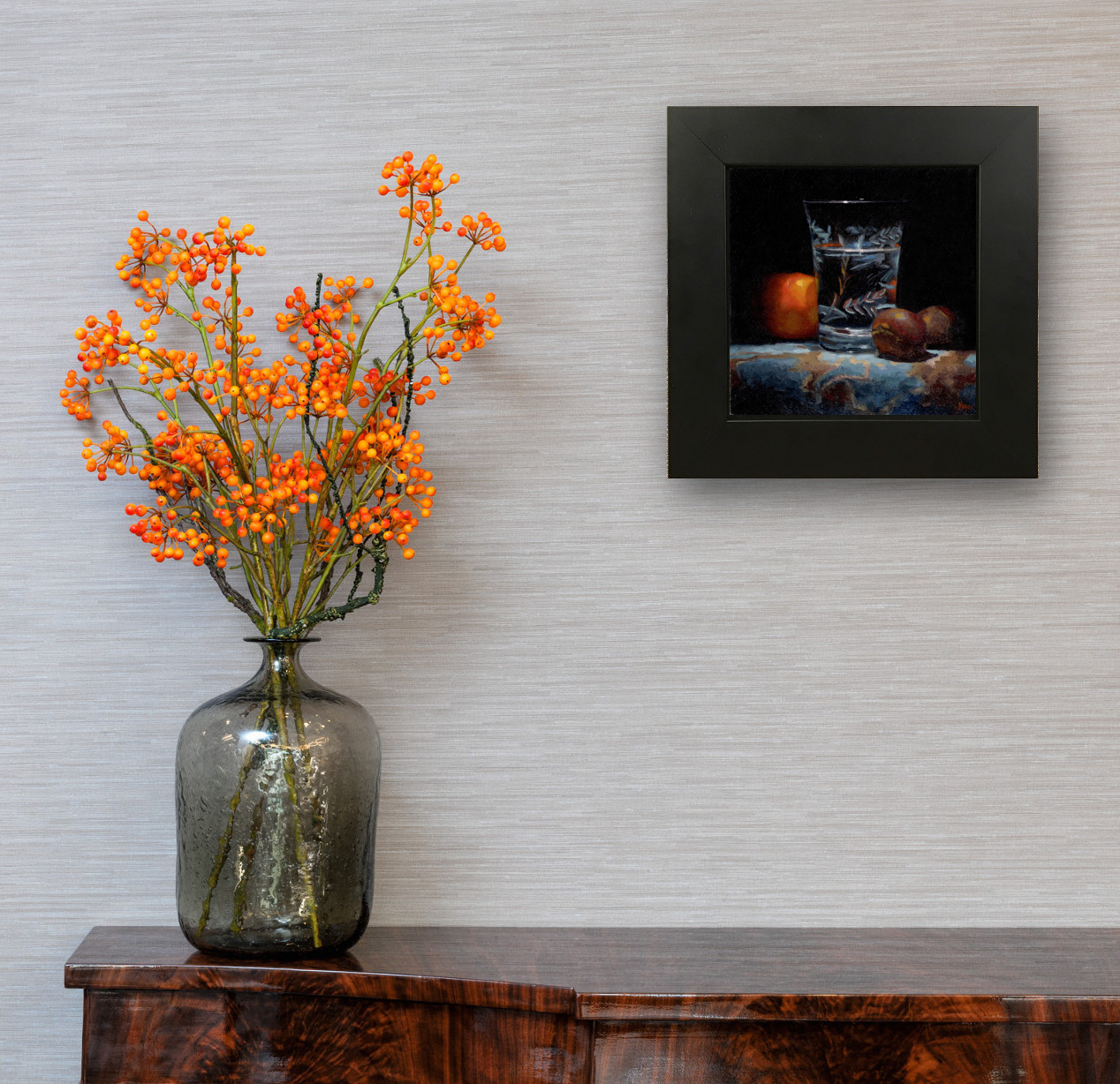 The piece is painted on a prepared wood panel, chosen for its archival strength and its ability to support precise, delicate transitions of light and color. The surface is primed by hand using time honored methods, creating a smooth and stable foundation that enhances the clarity of the etched glass, the fruit, and the patterned cloth.