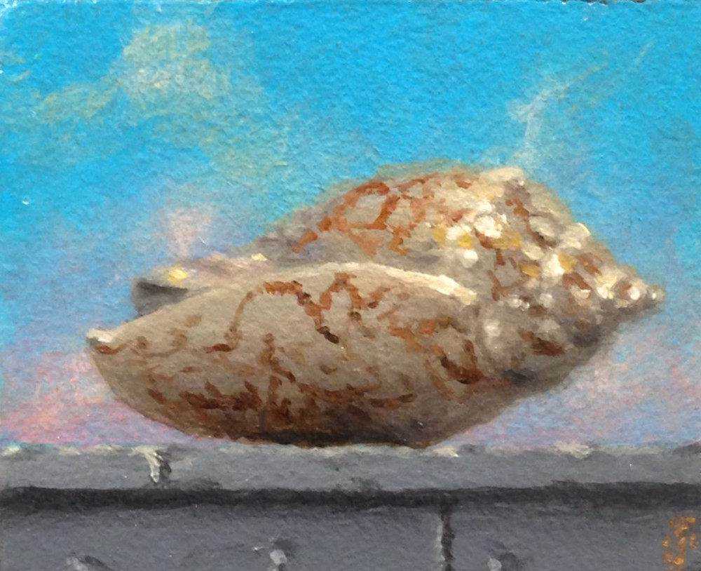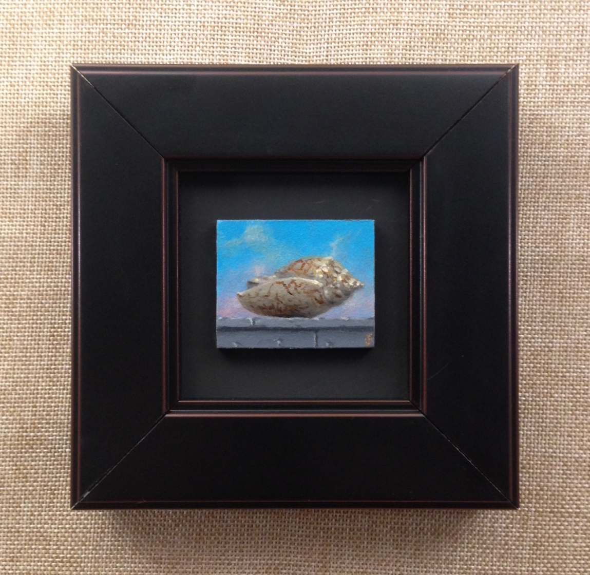 “Sunbather No. 3” is a meticulously crafted miniature oil painting, roughly the size of a large postage stamp.