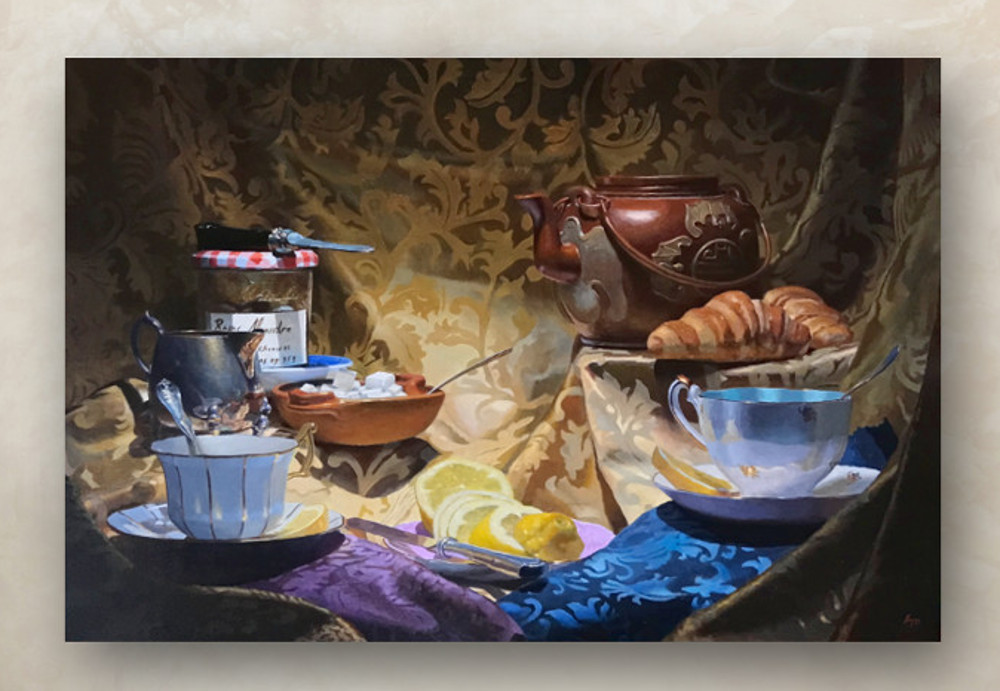 Tea and Croissants was created using a traditional process that has remained largely unchanged for over five centuries, known as the Flemish Technique. This meticulous approach allows for precise control over light, form, and depth, bringing a luminous realism to the final composition.