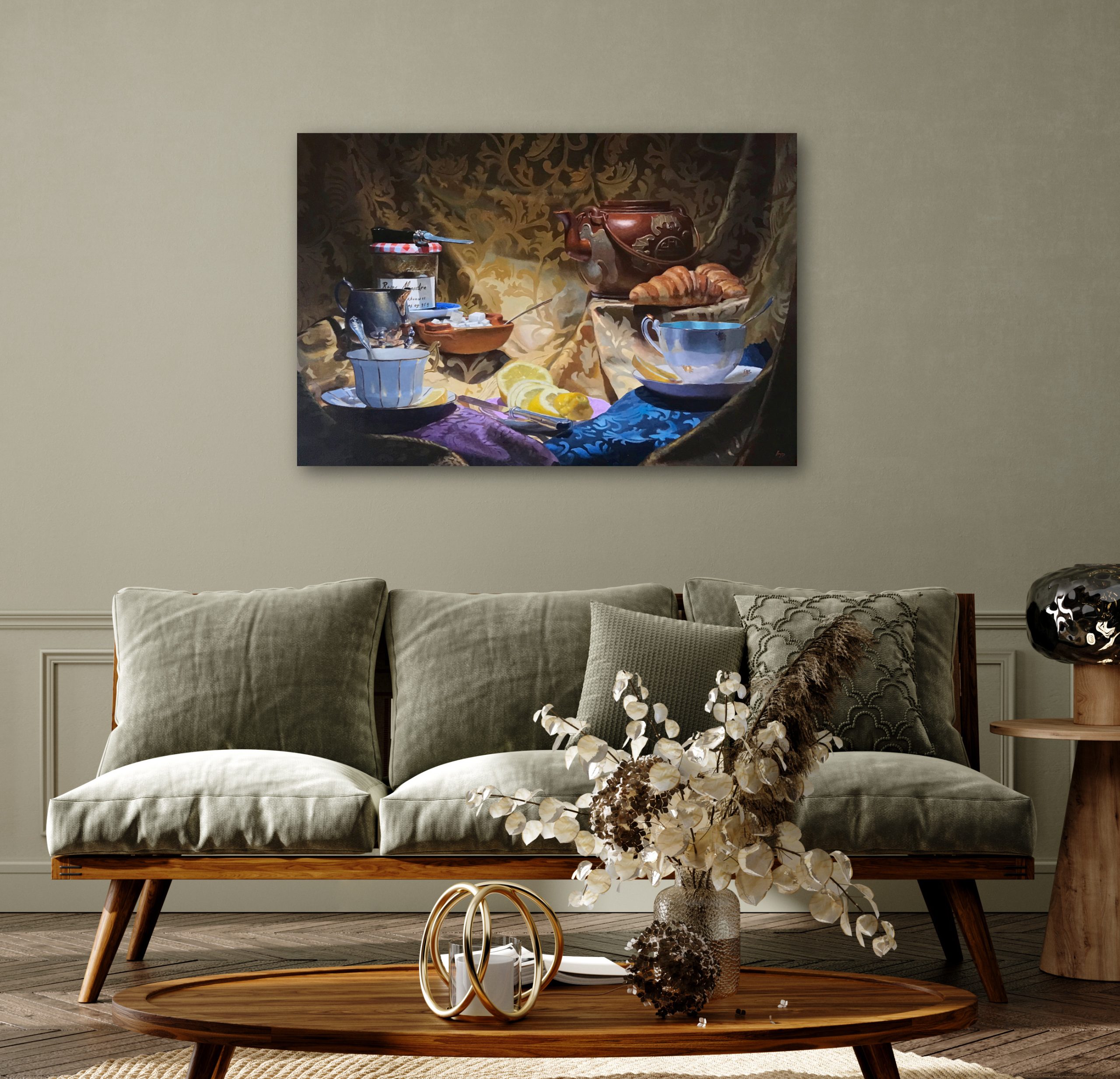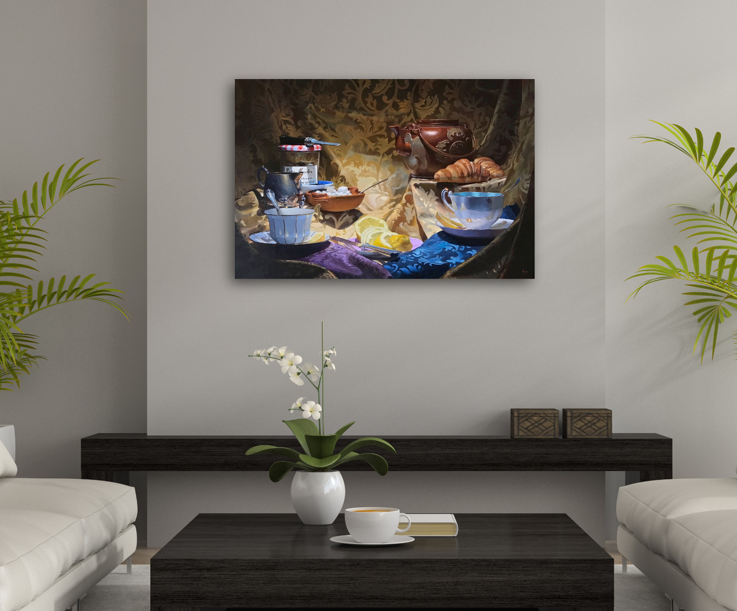 Every element of this painting, from the gentle glow of the teacups to the crinkled folds of damask fabric, has been created with a commitment to lasting beauty. Designed to stand the test of time, Tea and Croissants invites the viewer into a scene of quiet indulgence, capturing the warmth and refinement of a perfectly arranged morning table.
