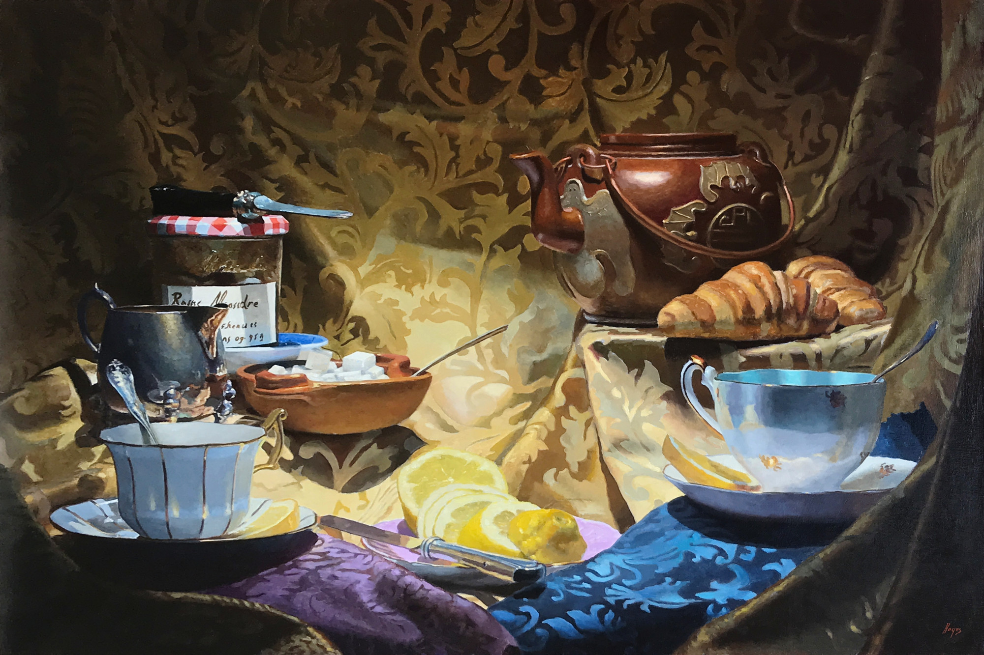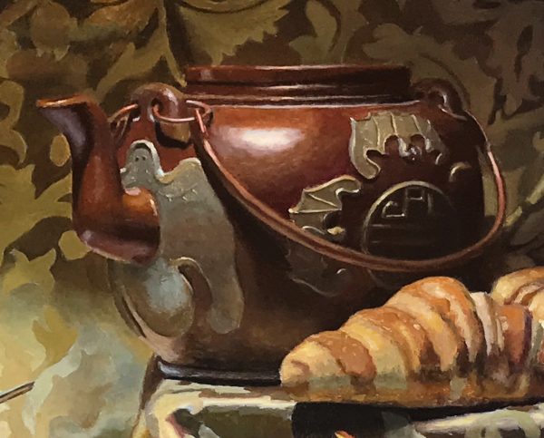 Tea and Croissants measures 24 × 26 inches (61 × 66 cm) and is painted with oil on prepared panel, following time-tested traditional methods.
