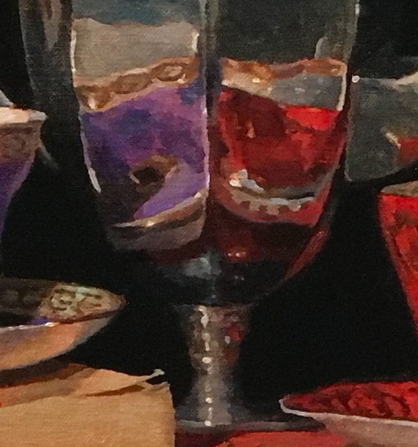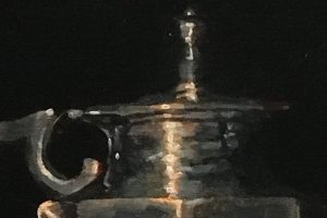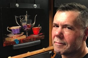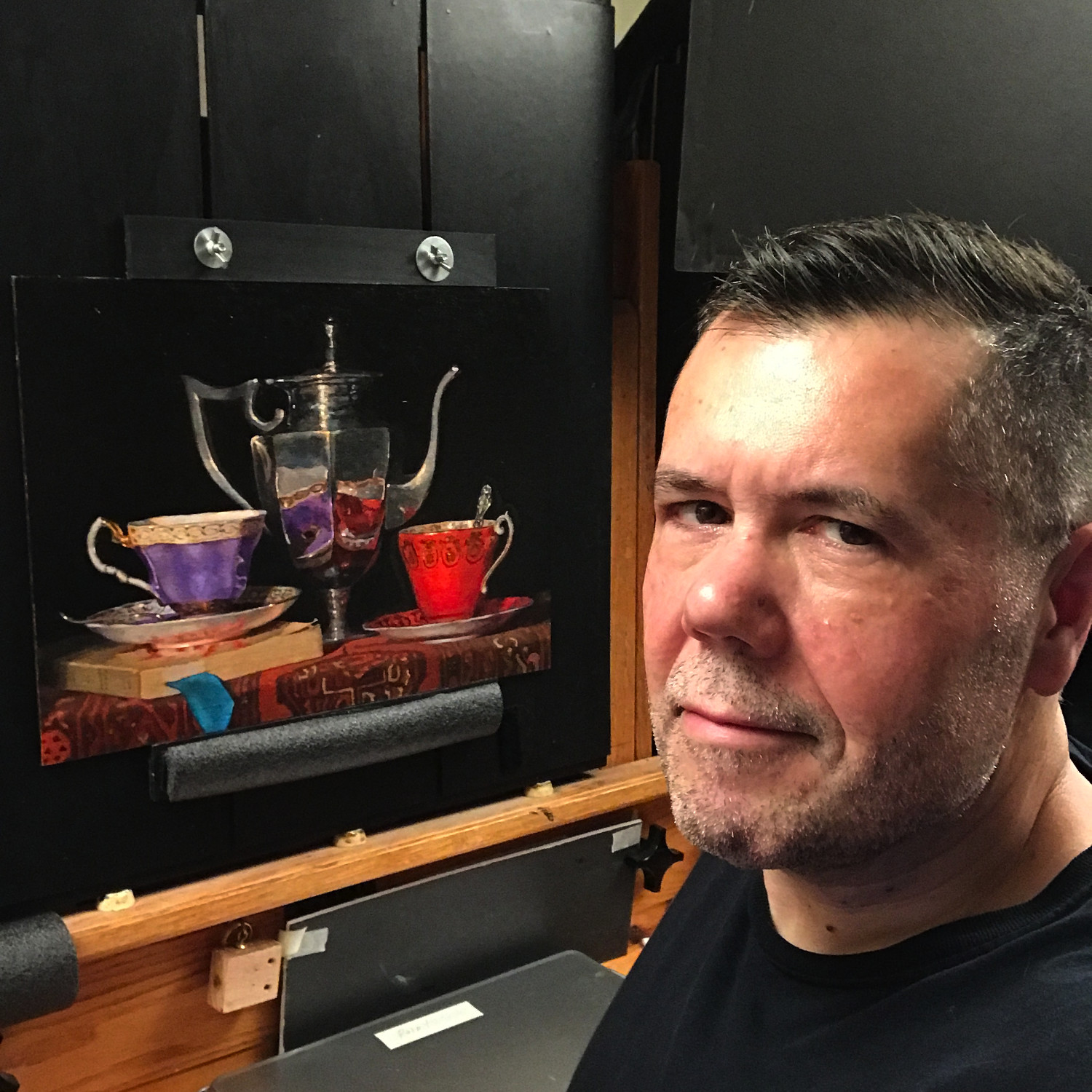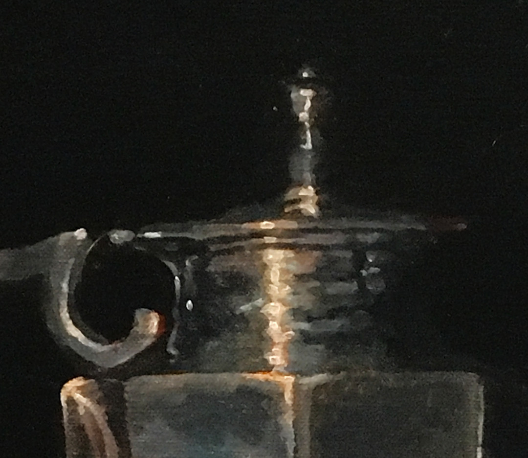 “Tea and Lore” was created using a traditional process very little changed for 500 years. The arrangements of objects are often set up in a large shadow box next to the easel. This allows careful control of the lighting and precise positioning of the composition.