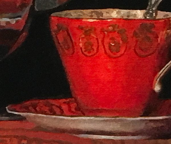“Tea and Lore” is an original still life painting, done with oil on linen on panel.