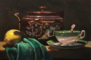 “Tea with Green Velvet” is an original still life, painted in oil on linen on panel, that captures a quiet moment of elegance. The composition features an antique teapot, a fresh lemon, and a teacup, all set against the soft folds of a rich green velvet cloth. The interplay of textures and reflective surfaces invites a sense of calm contemplation.