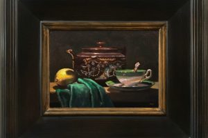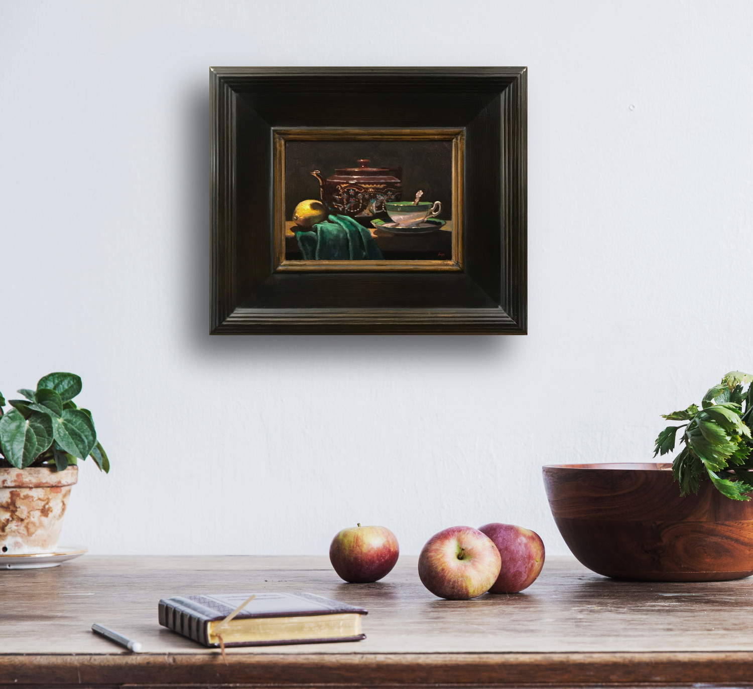 “Tea with Green Velvet” was created using a traditional process very little changed for 500 years, known as the Flemish Technique. The arrangement of objects was carefully composed in a controlled lighting environment, allowing for a precise balance of light and shadow to enhance the reflective surfaces of the teapot, the luminosity of the lemon, and the rich texture of the velvet cloth.