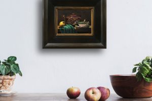 Only the finest oil paints have been selected, chosen for their richness, depth, and permanence. Many of the pigments used in this piece have been sourced from traditional locations around the world, known for their historical significance and lasting brilliance. The deep green of the velvet cloth is enriched with Bohemian green earth, a pigment cherished since the Renaissance for its subtle tonal variations. The details in the teapot are achieved using lapis lazuli from Afghanistan, known for its radiant, cool luminosity. The golden reflections dancing along the teacup’s rim and the lemon’s surface are rendered with Chinese vermilion, historically prized for its brilliance and depth.