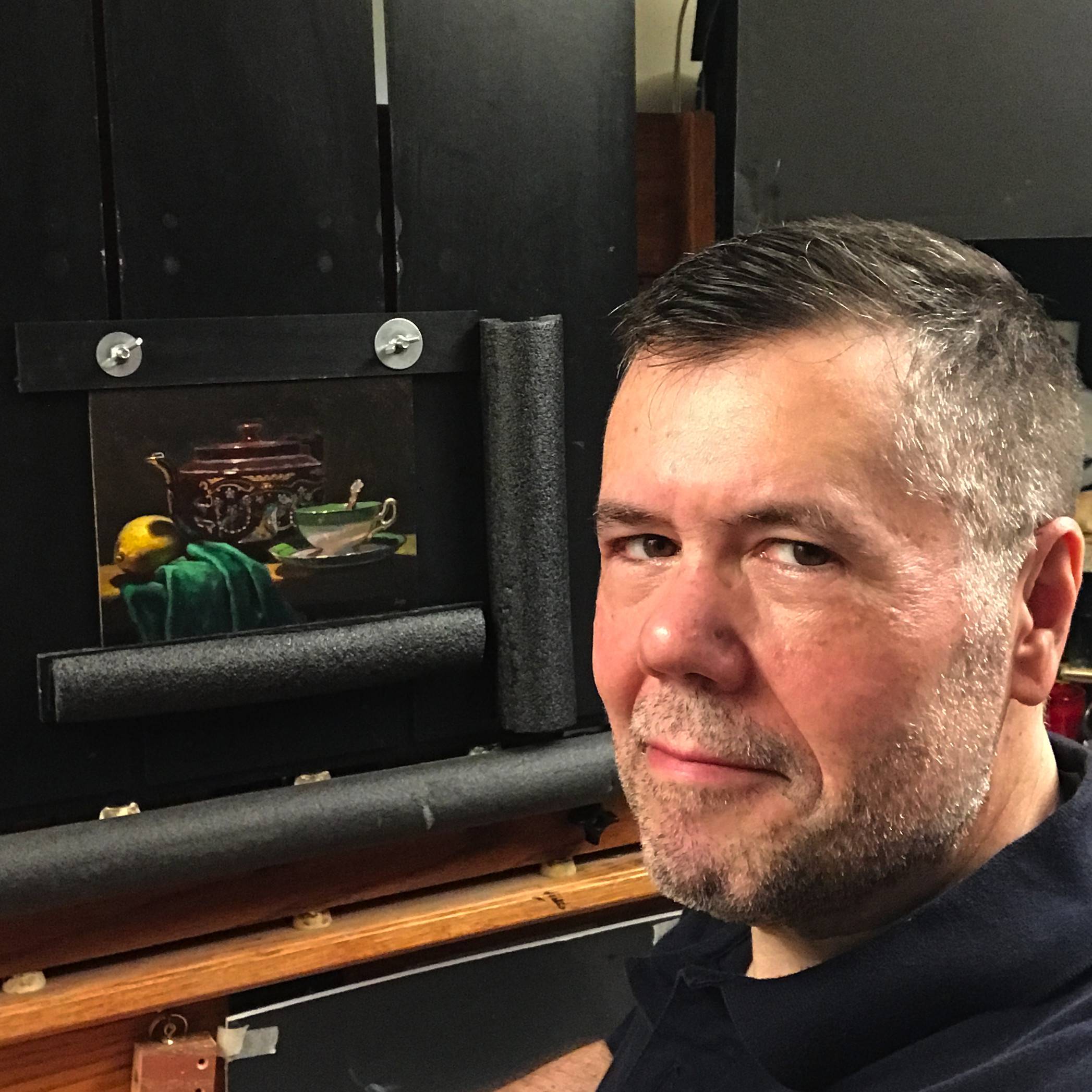 After several days, once the underpainting was sufficiently dry, the color layer was applied—this is what you see in the finished painting. The color was carefully built up in transparent layers, a process known as “glazing.” These thin washes create a jewel-like depth and glowing transparency of color, which enhances the delicate highlights on the porcelain, the warm reflections in the metal, and the soft, luxurious folds of the green velvet cloth.