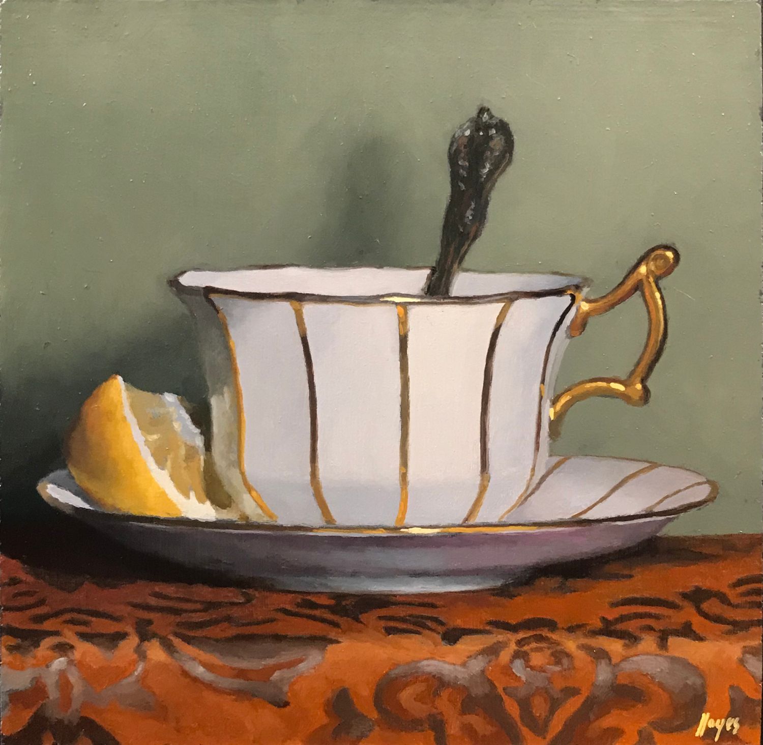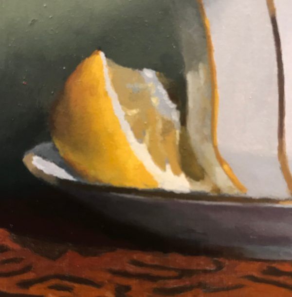 “Teacup and Lemon on Red Silk” is an original still life painting, done with oil on panel.