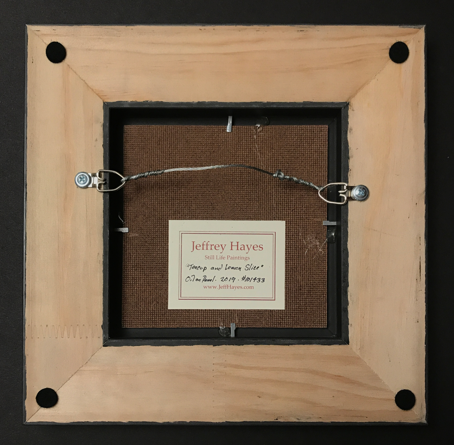 “Teacup and Lemon Slice” measures 5 x 5 inches (12 x 12 cm), and is presented in a flat panel black frame with a beveled edge. The outer dimensions of the frame are 11 x 11 inches (28 x 28 cm). Felt pads are affixed to each corner of the back of the frame to prevent any damage to your wall and to ensure that the painting rests perfectly parallel to the wall.