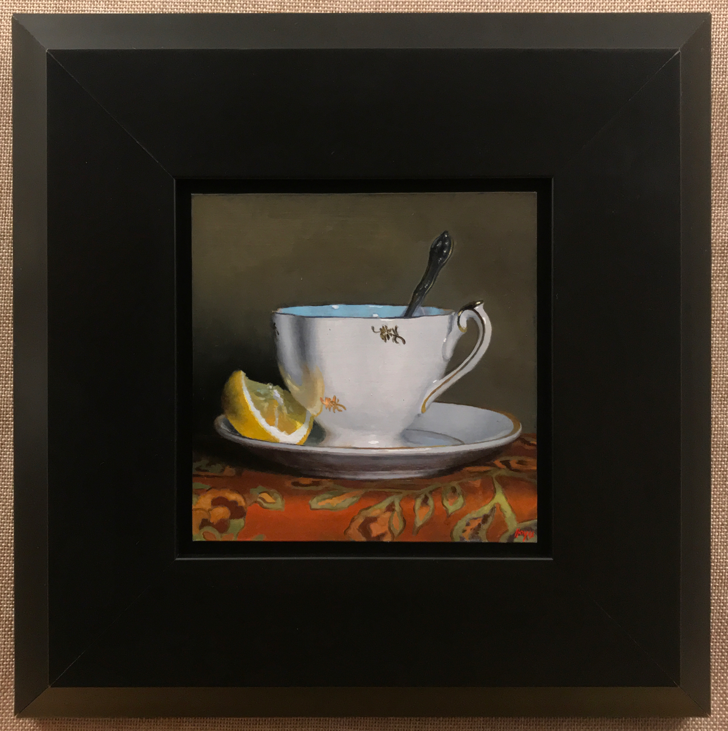 “Teacup and Lemon Slice” is an original still life painting. It features a porcelain teacup with gold accents, silver spoon, and fresh lemon slice. The entire composition rests on a brocaded floral cloth.