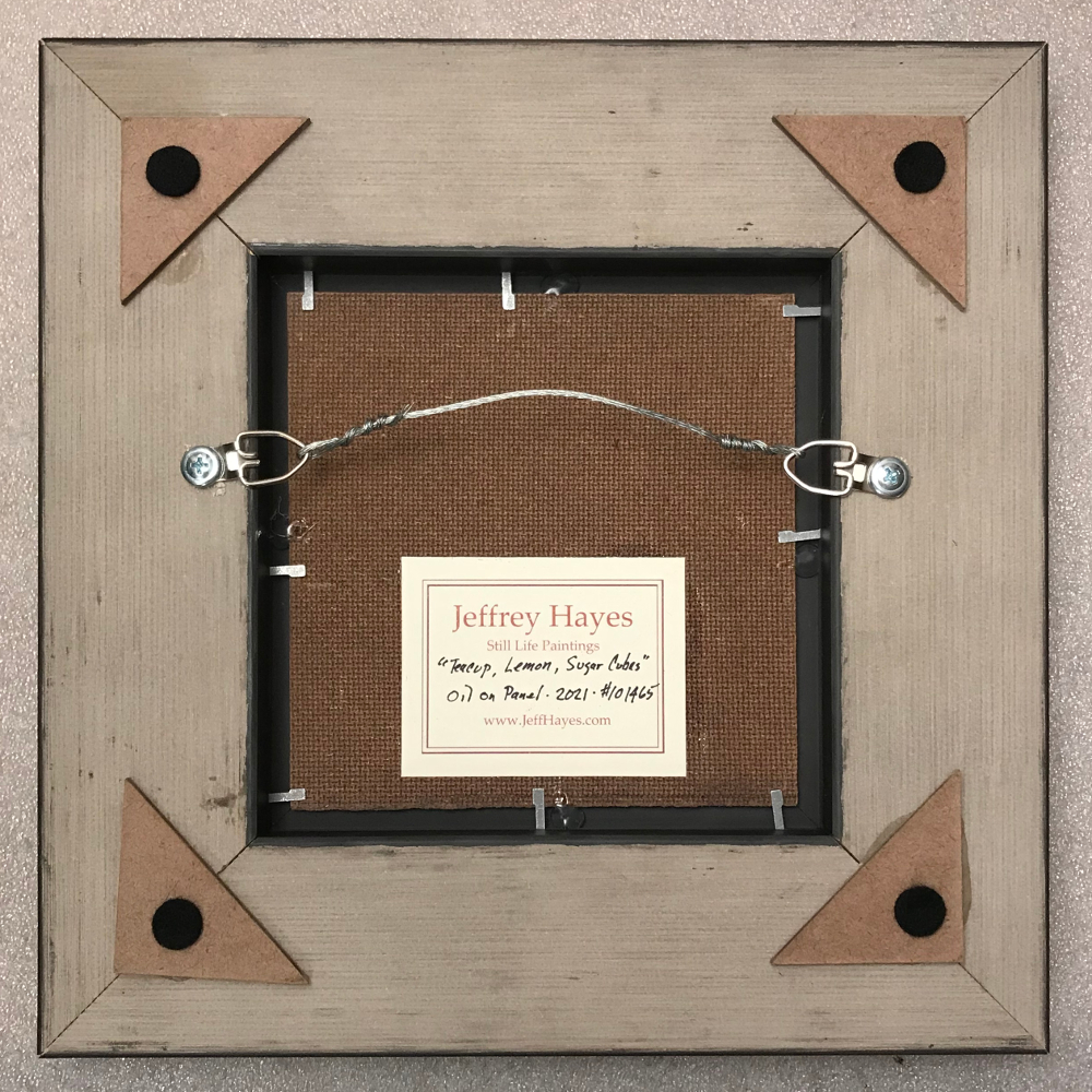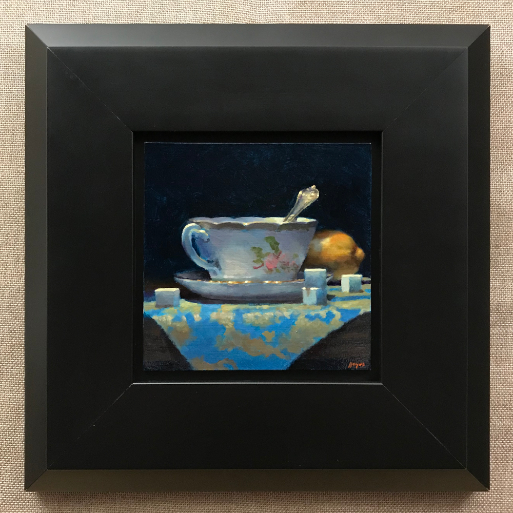 “Teacup, Lemon, Sugar Cubes” measures 5 x 5 inches (12 x 12 cm), and is presented in a flat panel black frame with a beveled edge. The outer dimensions of the frame are 11 x 11 inches (28 x 28 cm). Felt pads are affixed to each corner of the back of the frame to prevent any damage to your wall and to ensure that the painting rests perfectly parallel to the wall.