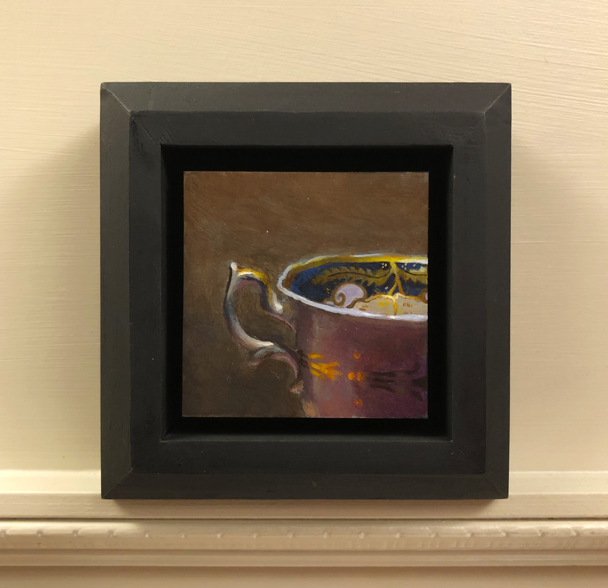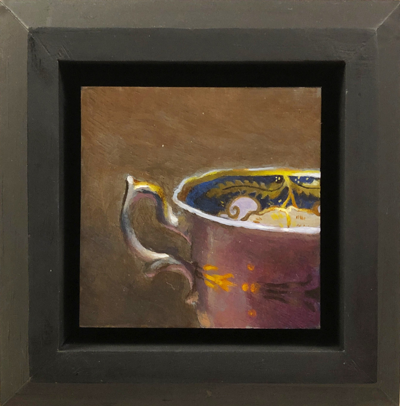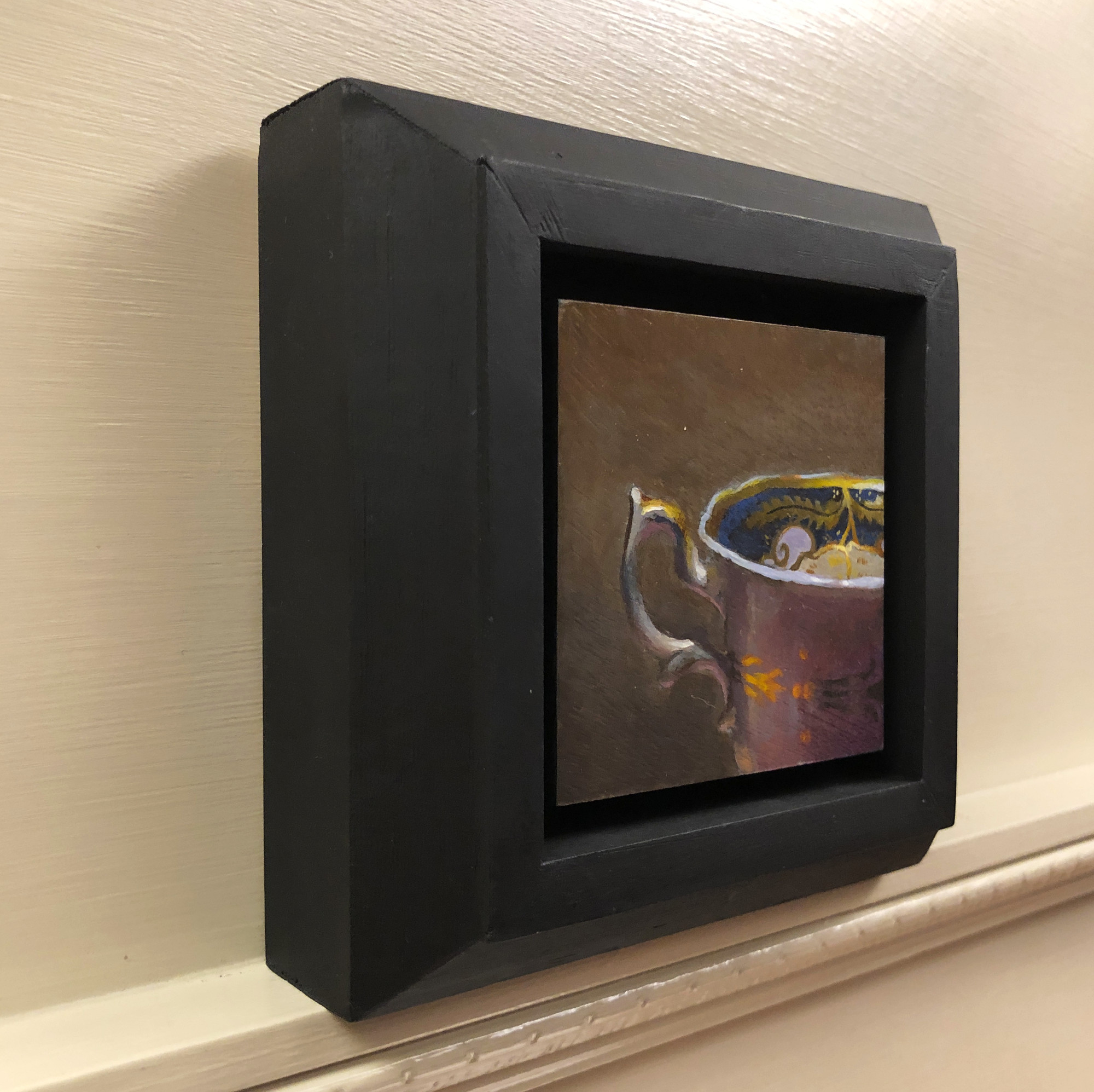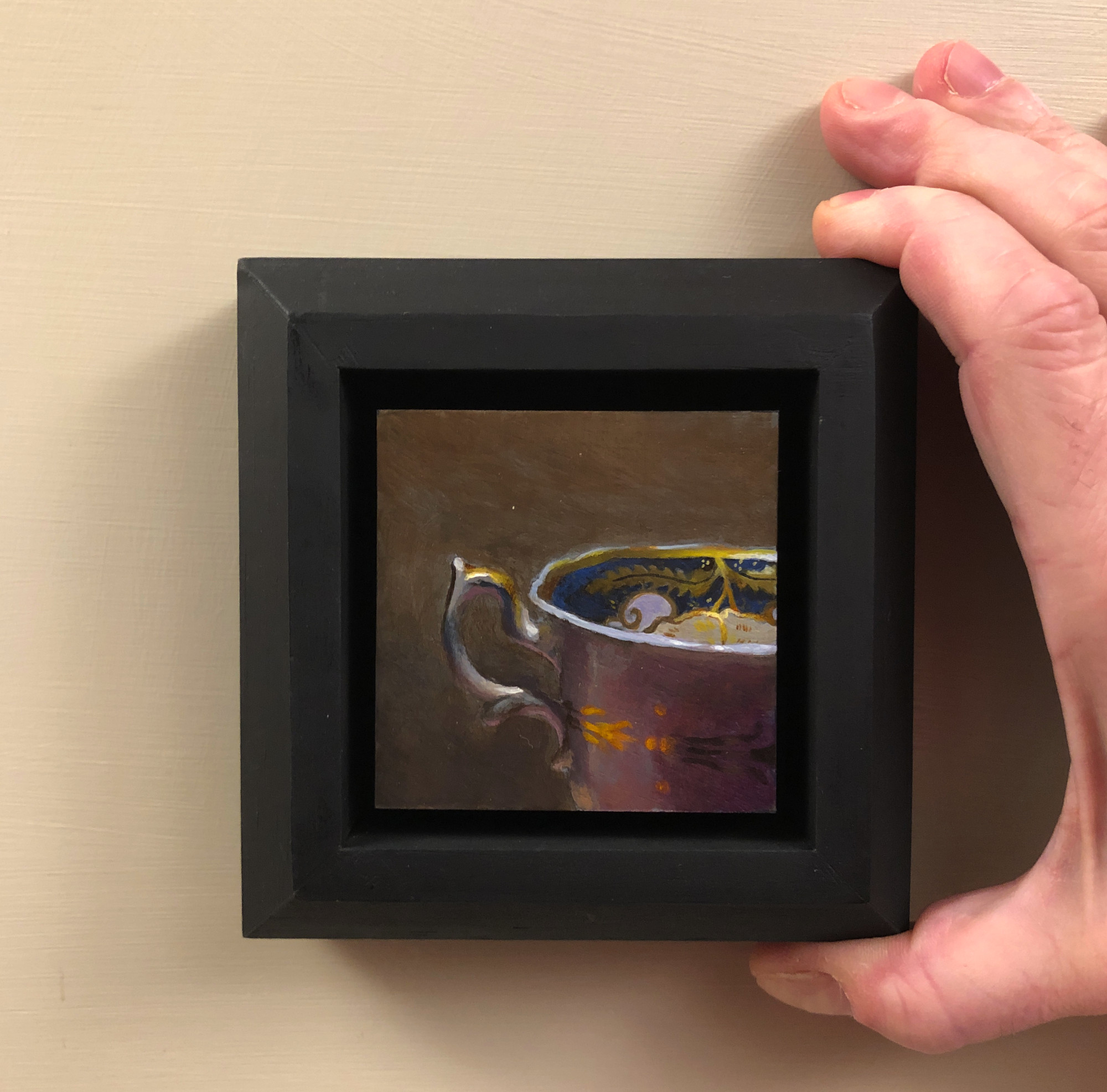 “The Golden Edge” is a 3×3-inch oil painting that captures the refined beauty of a finely crafted teacup. Framed in a handmade black setting with steeply beveled sides, the painting appears to float within a window of light and shadow. The 4.5×4.5-inch outer dimensions create a striking presentation, drawing attention to the intricate details within the composition.