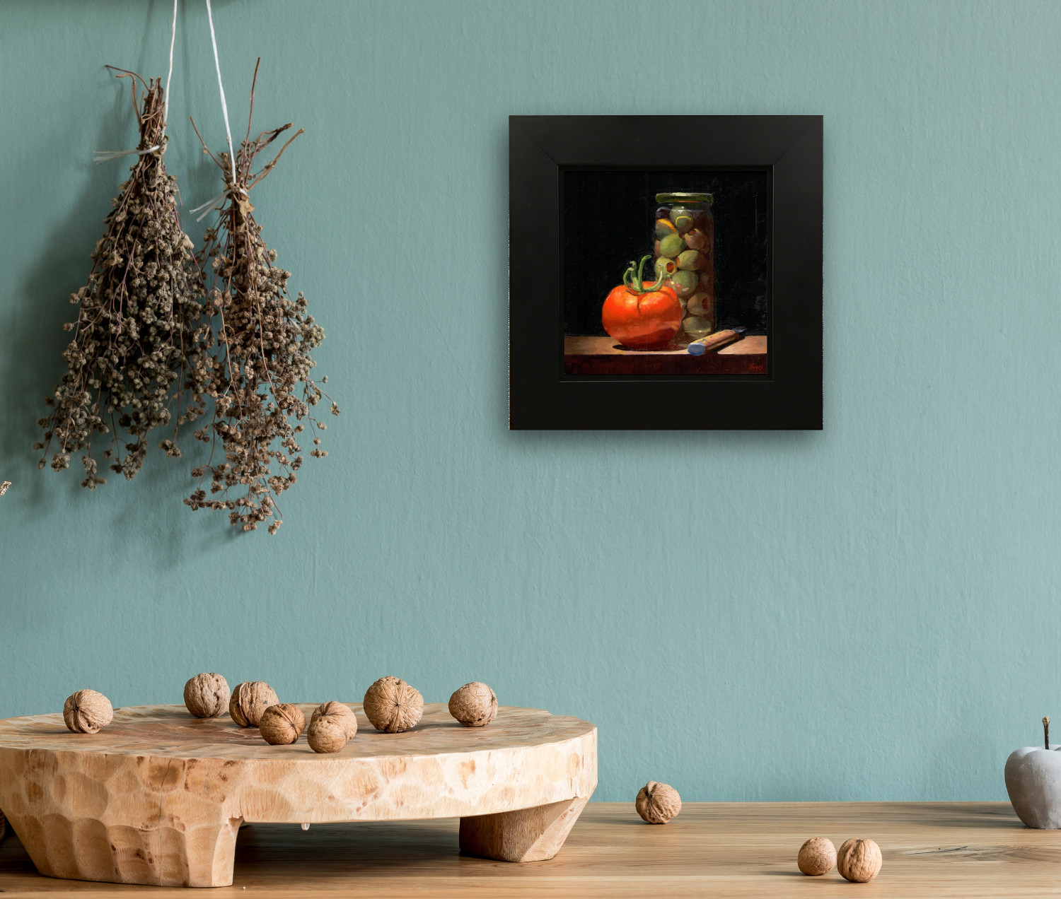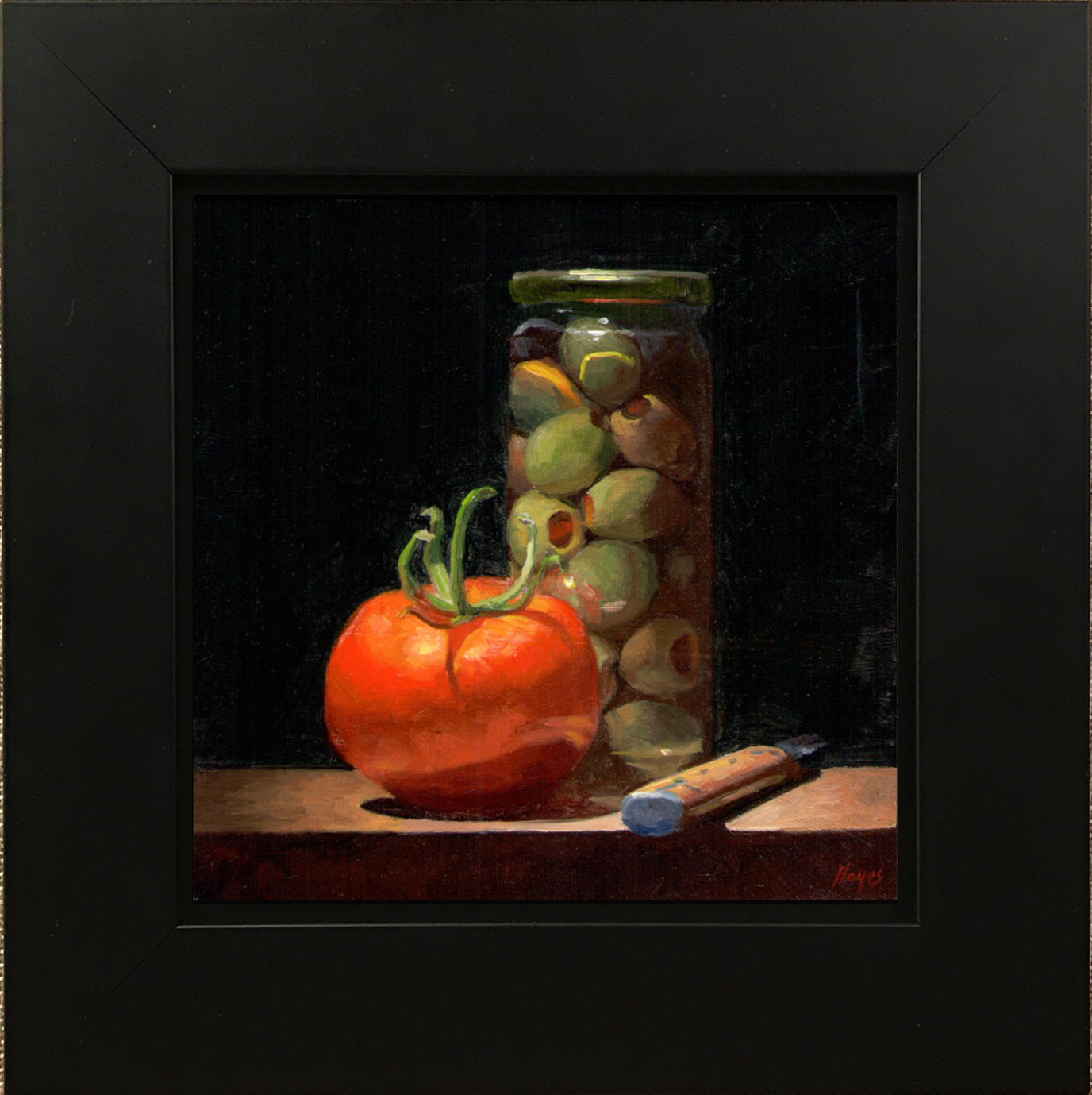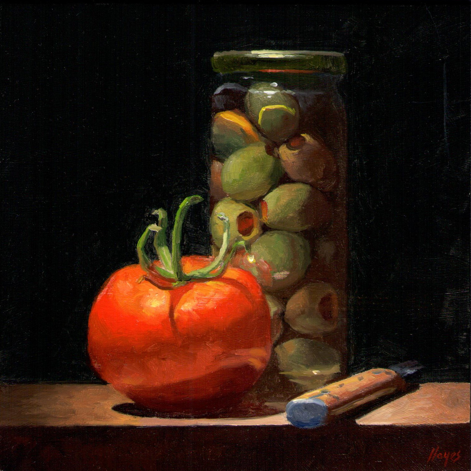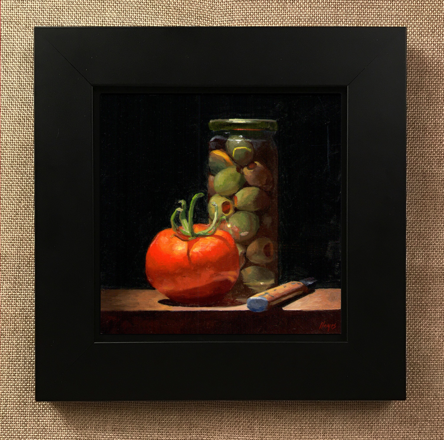 “Tomato and Olives” is an original still life painting, done with oil on panel.
