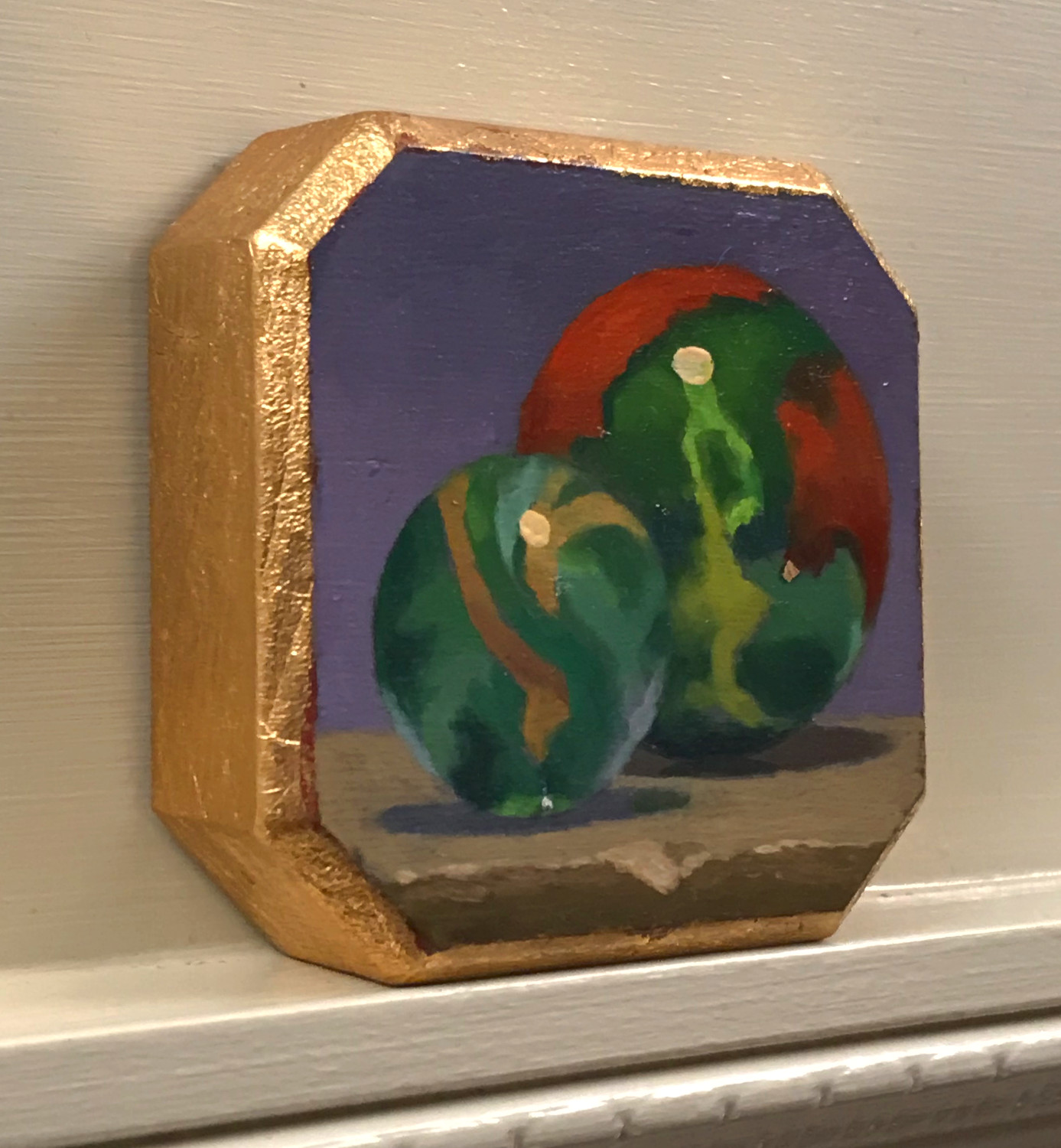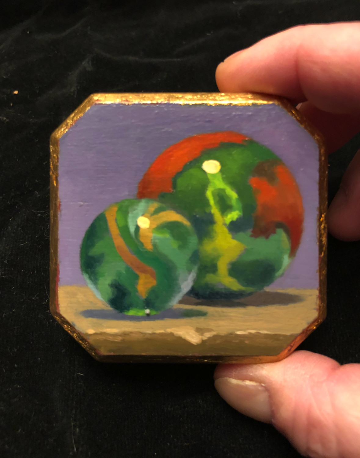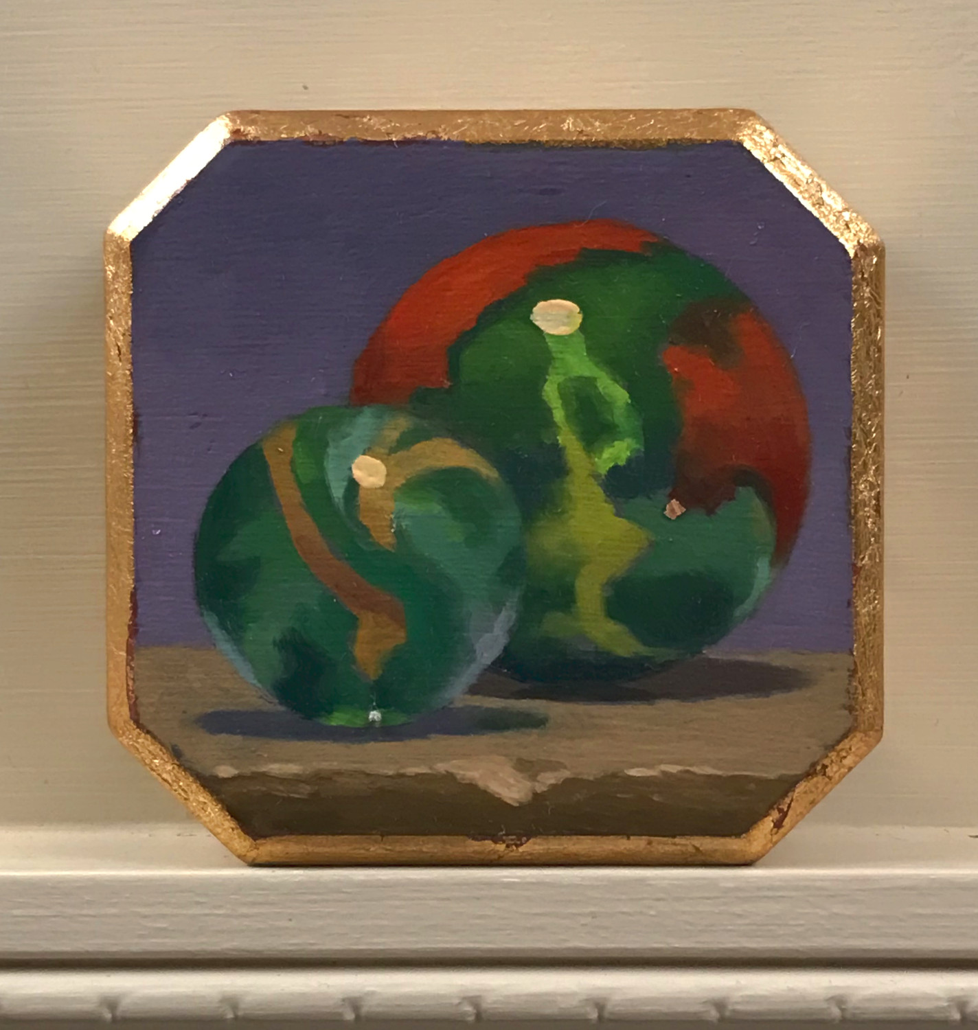 “Two Marbles No. 4” is the portrait of a pair of marbles, done with oils.