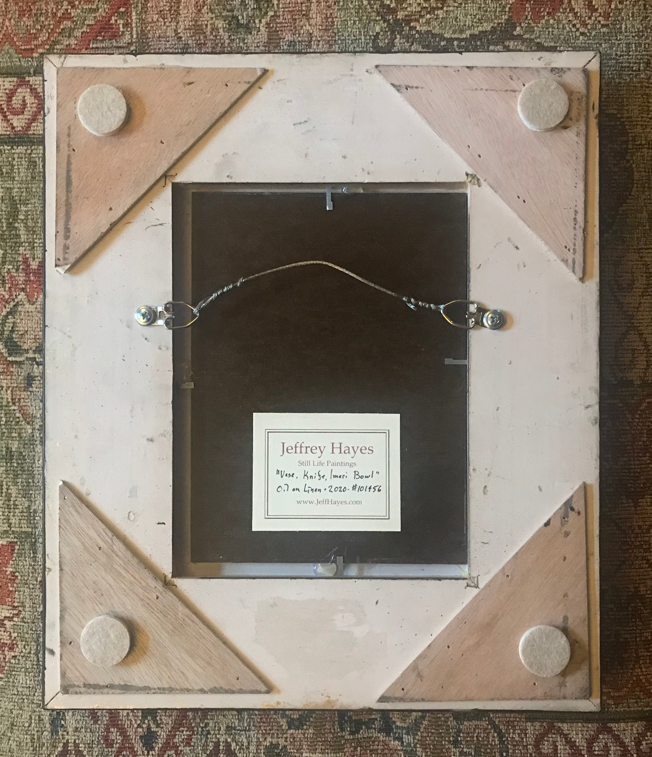 “Vase, Knife, Imari Bowl” measures 8 x 6 inches (20 x 15 cm), and is presented in a black frame with an angled panel and an inner gold leaf lip. The outer dimensions of the frame are 14 x 12 inches (35 x 30 cm). Felt pads are affixed to each corner of the back of the frame to prevent any damage to your wall and to ensure that the painting rests perfectly parallel to the wall.