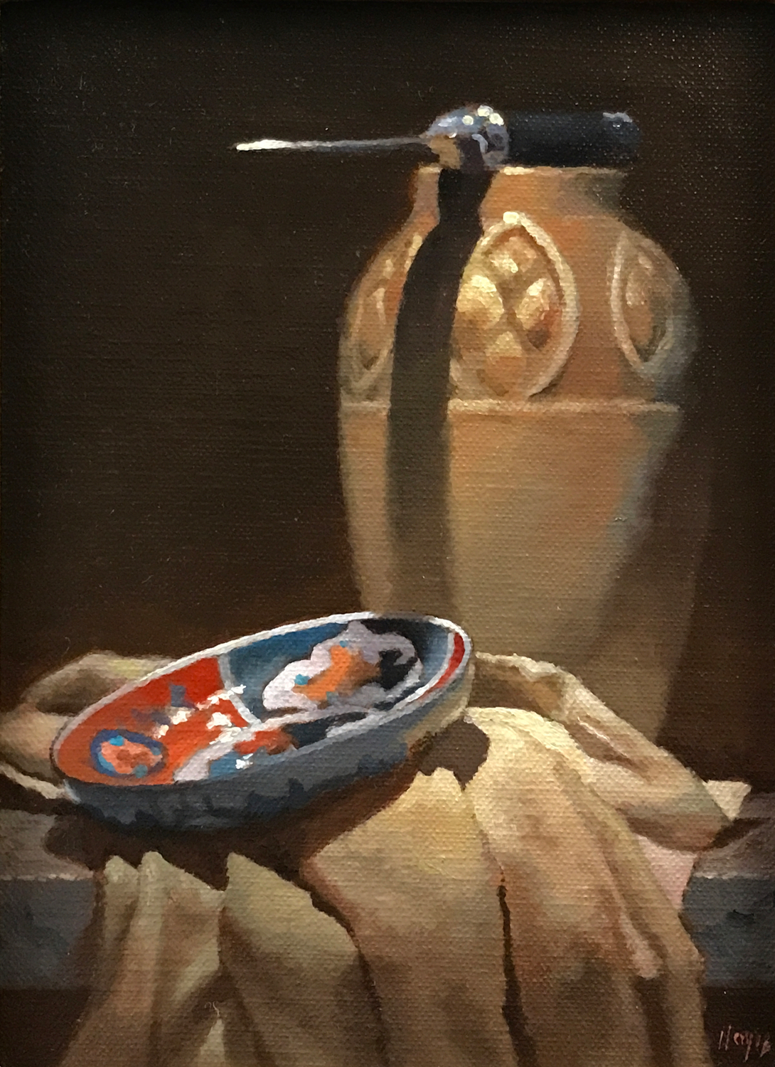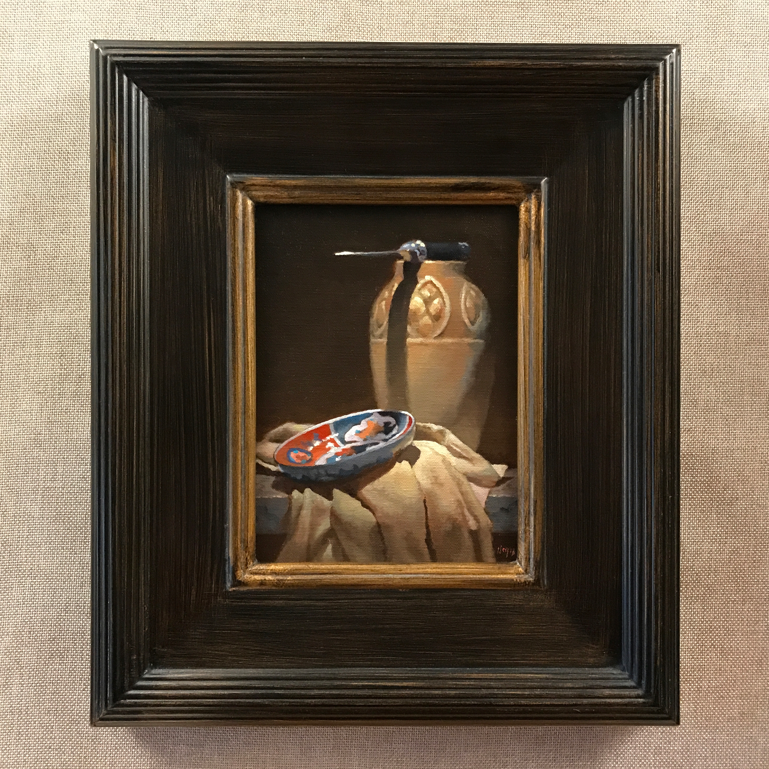 “Vase, Knife, Imari Bowl” is an original still life painting, done with oil on linen panel.