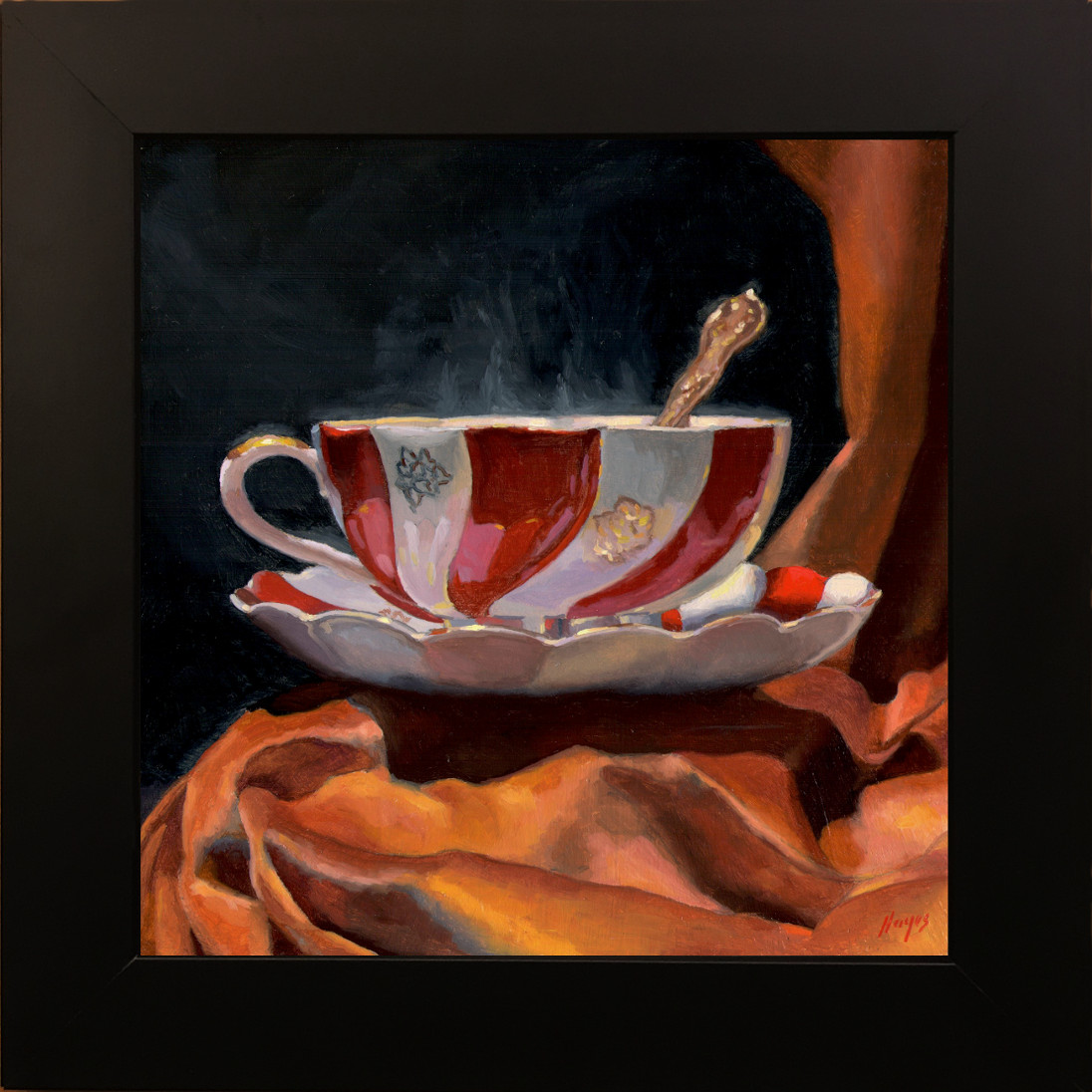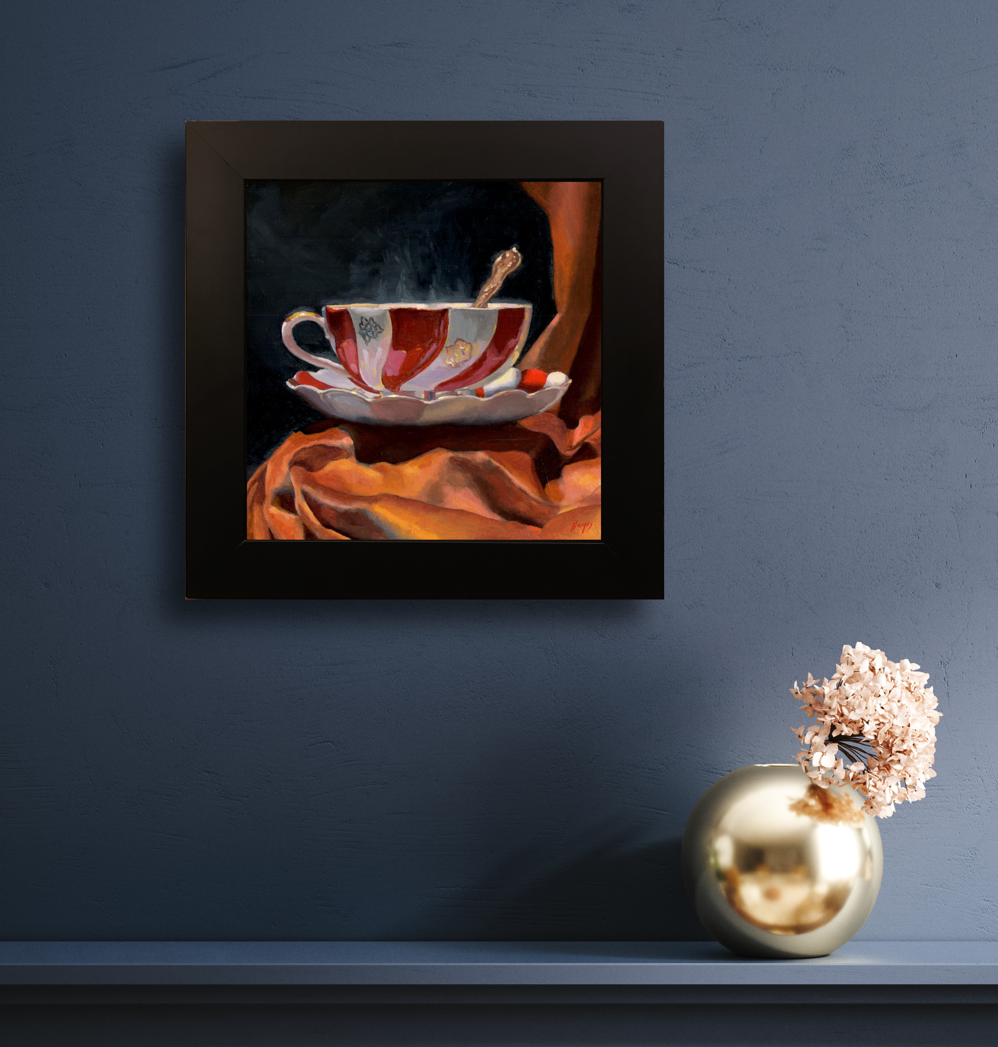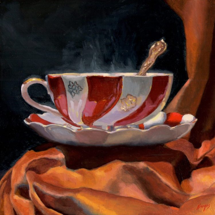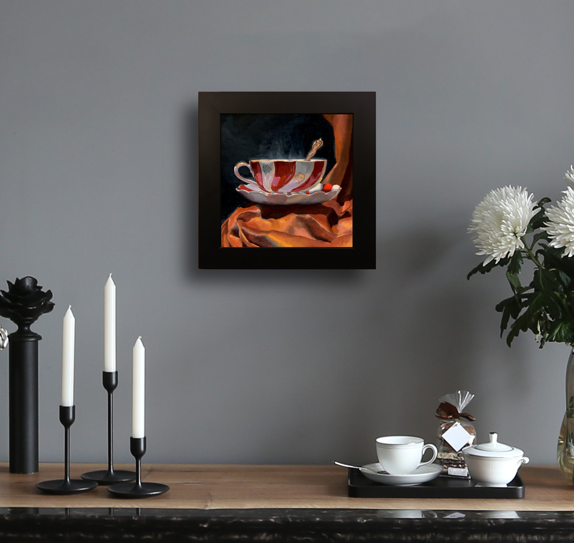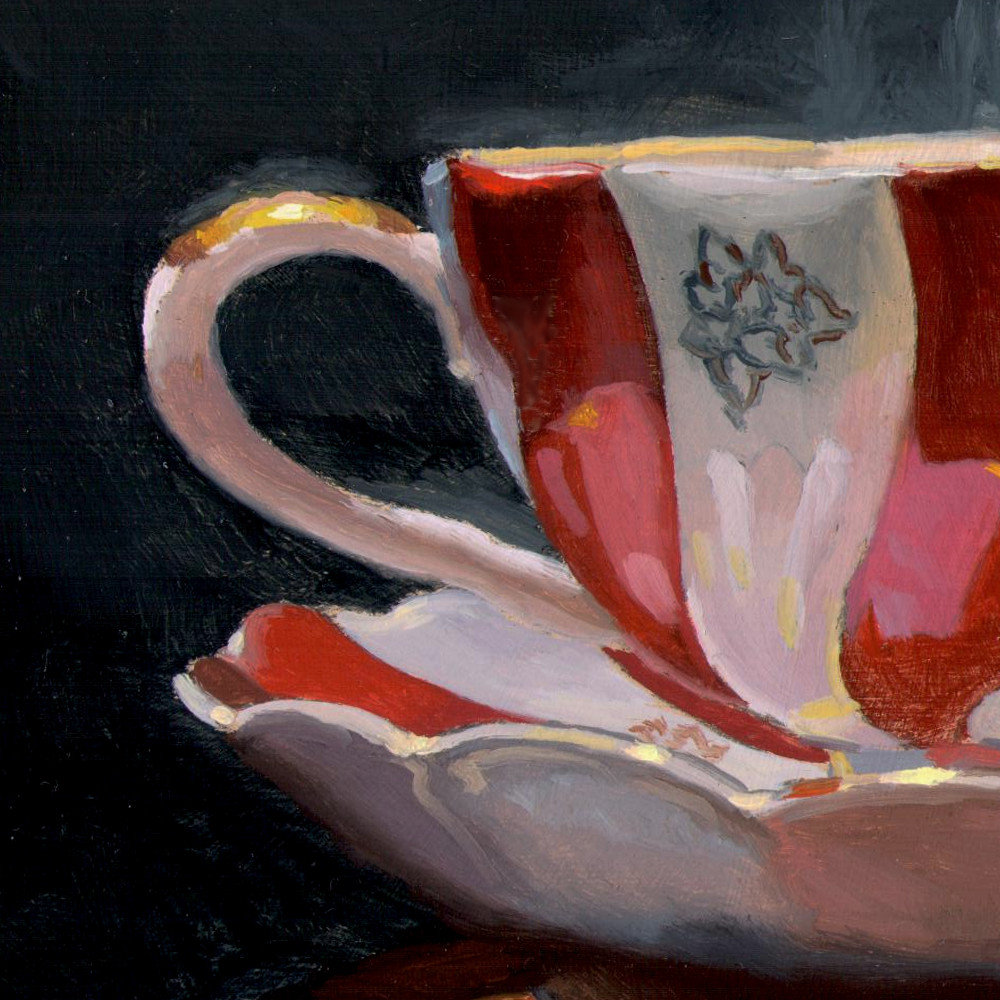 Color was built up in transparent layers, allowing light to pass through each veil of paint and reflect back from the surface, creating a quiet inner glow. Particular care was taken with the sheen of the velvet, the porcelain’s soft glimmer, and the almost imperceptible motion of the steam—elements that depend on precision and restraint.