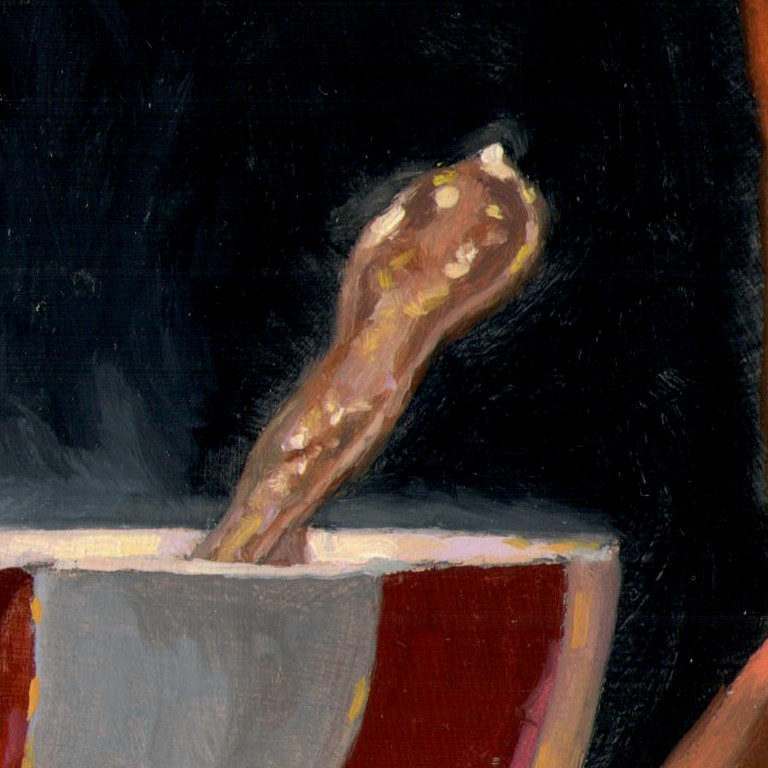 Panel has long been prized by painters for its durability and precision. Its rigid structure allows for fine control of the brush, which is essential when capturing intricate textures like the deep folds of velvet or the soft edges of rising steam. The surface responds beautifully to layered glazes, making it possible to achieve the restrained luminosity seen throughout the composition.