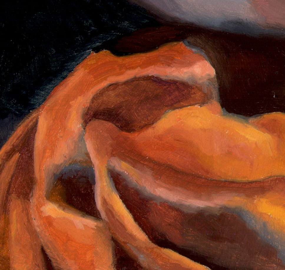 Velvet, with its deep shadows and reflective pile, seemed to absorb time itself. The rising steam caught in the light, ephemeral and luminous, became a momentary bridge between the physical and the intangible. These small visual gestures—fleeting, gentle, easily missed—are what drew this painting into being.