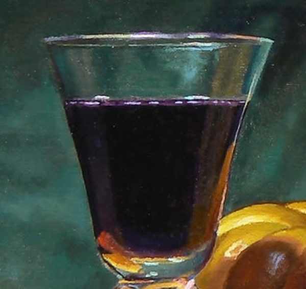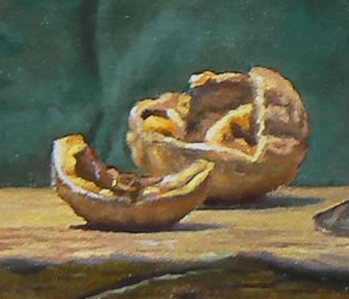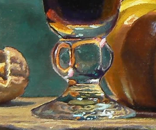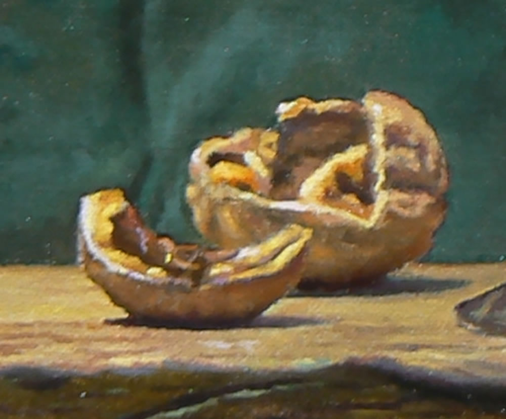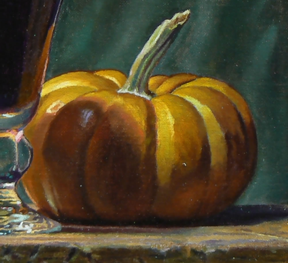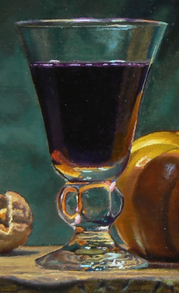 After several days, once the underpainting was sufficiently dry, the color layer was applied—this is what you see in the finished painting. The color was carefully built up in transparent layers, a process known as “glazing.” These thin washes create a jewel-like depth and glowing transparency of color, which enhances the deep red of the wine, the golden warmth of the pumpkin, and the earthy tones of the walnuts.