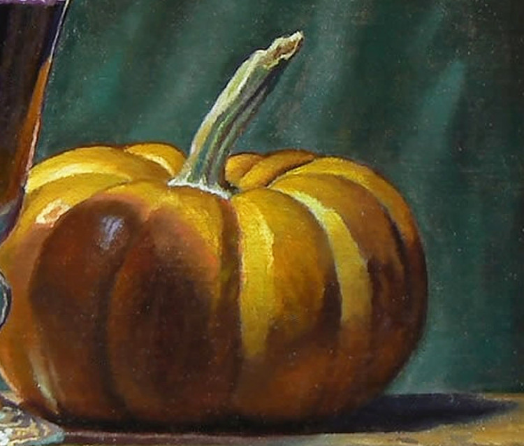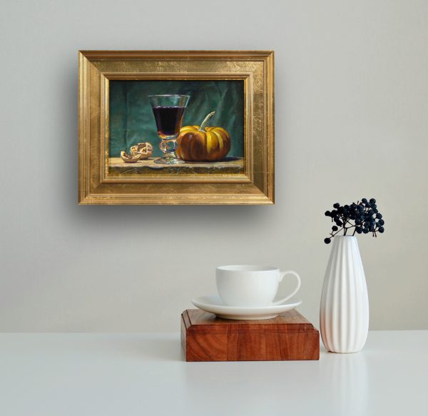 Only the finest oil paints have been selected, chosen for their richness, depth, and permanence. Many of the pigments used in this piece have been sourced from traditional locations around the world, known for their historical significance and enduring brilliance. The luminous golden hues of the pumpkin are enriched by Bohemian green earth, a pigment historically prized for its subtle depth and cool undertones. The deep red of the wine is enhanced with Chinese vermillion, a pigment valued for its intensity and warmth. The dramatic shadows and highlights that bring the composition to life incorporate lapis lazuli from Afghanistan, a gemstone pigment treasured by master painters for its luminous blue qualities. Each color is chosen not only for its visual impact but also for its stability over time.