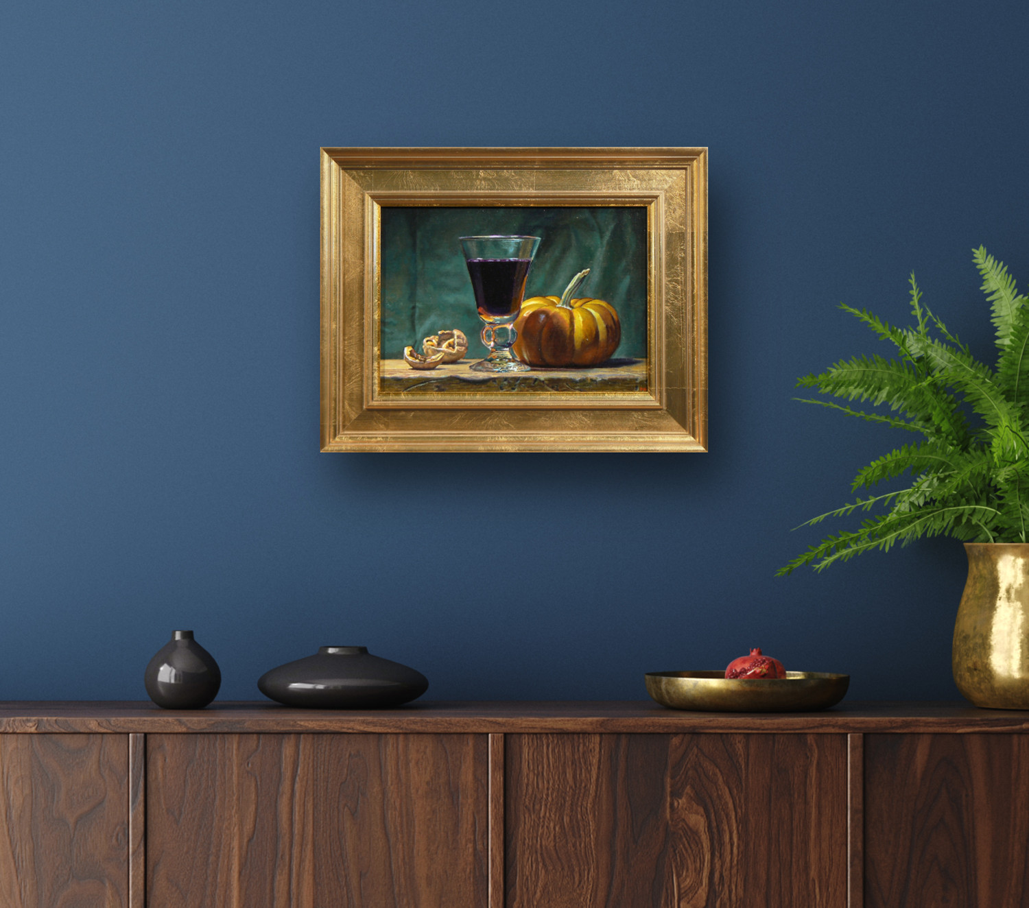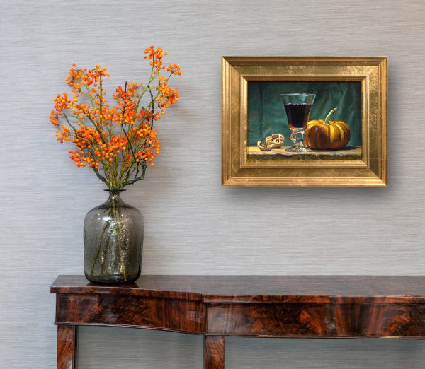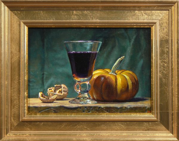 Through this time-honored process, “Walnuts, Wine, and Pumpkin” achieves a quiet yet rich presence, transforming a simple arrangement into a study of light, texture, and timeless elegance.