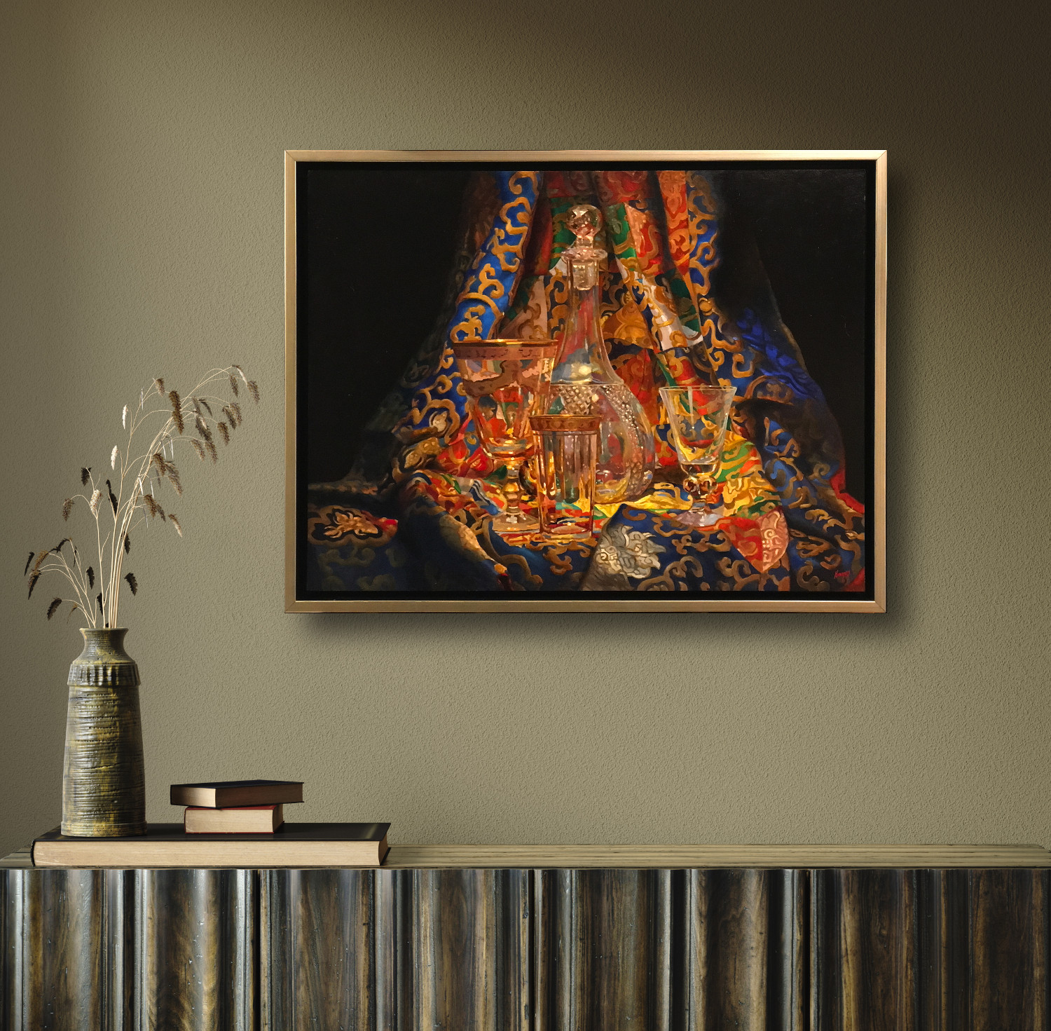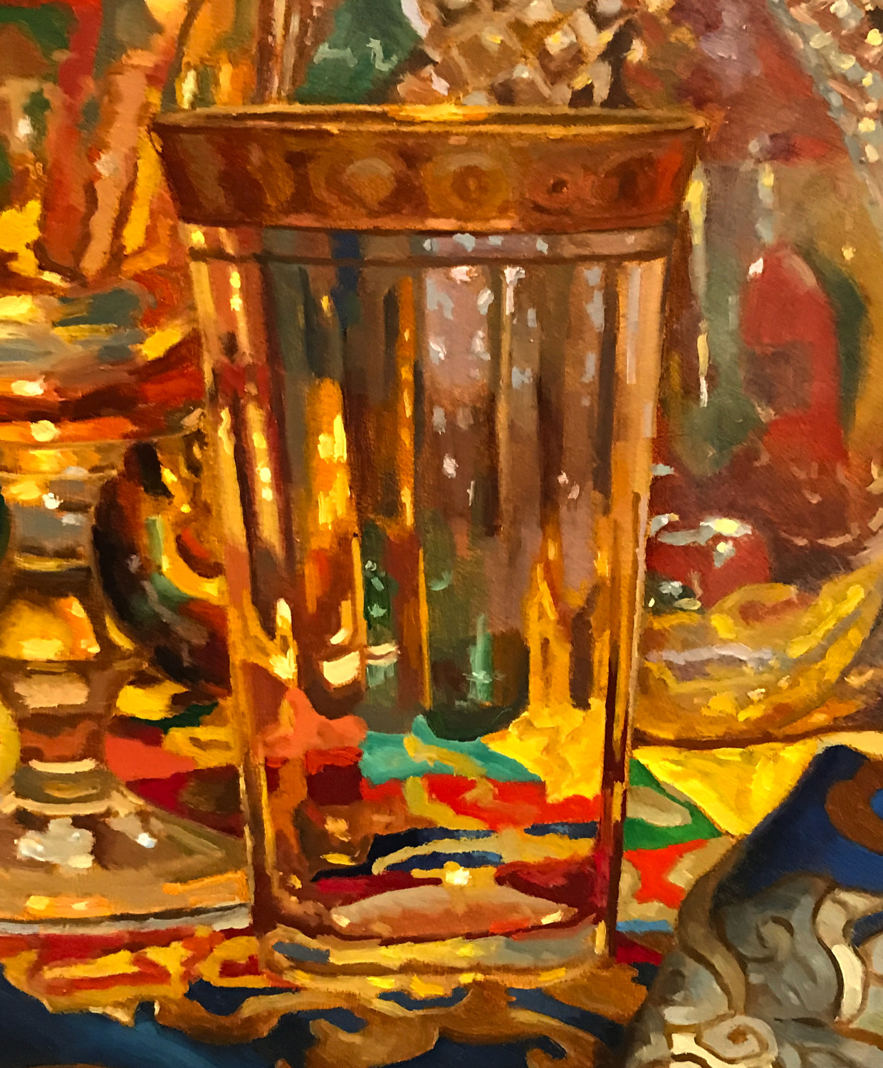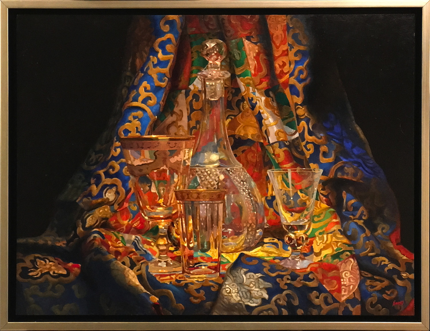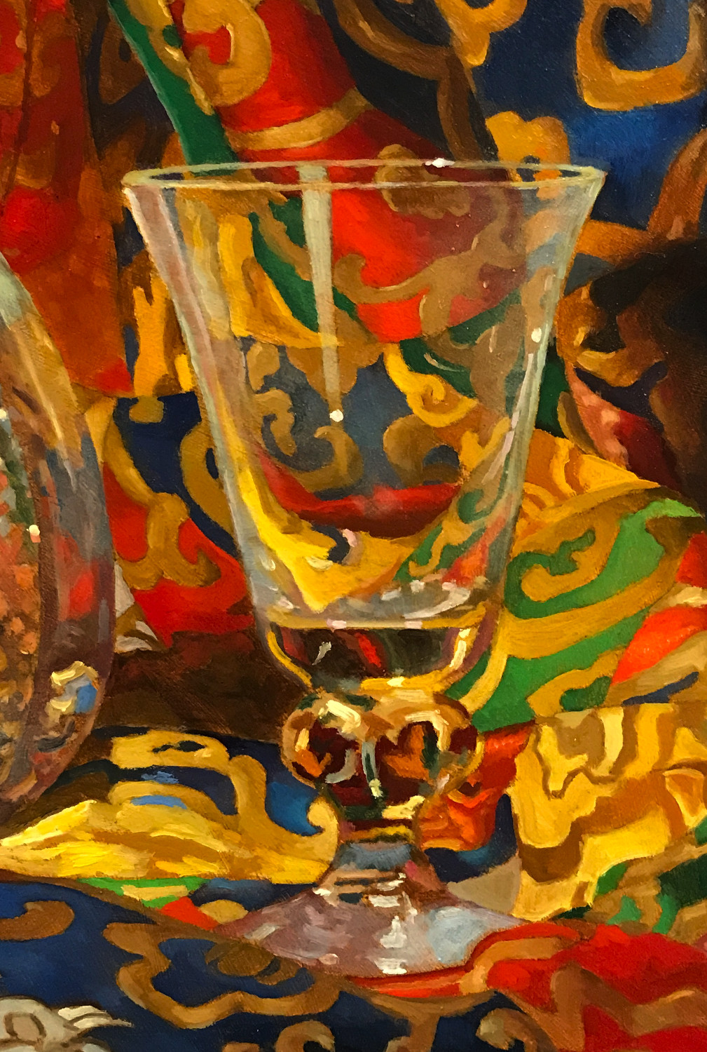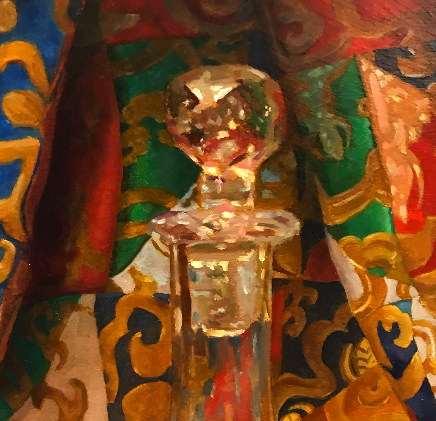 The painting is concerned with illumination. With how golden light gathers in the carved glass. With how the etched patterns soften the reflections. With how the folds of silk create a rhythmic movement of color, guiding the eye through both shadow and brilliance. Each surface responds differently, inviting the viewer to linger on the transitions that happen when reflective objects meet a richly patterned textile.