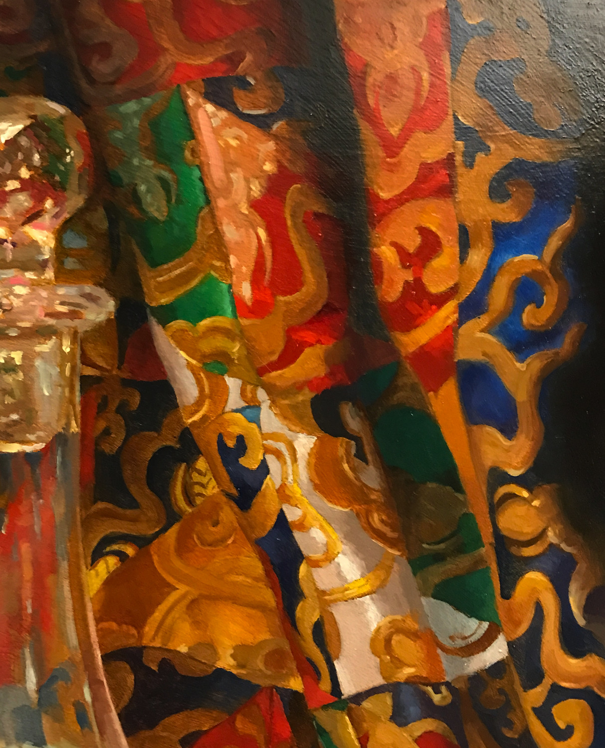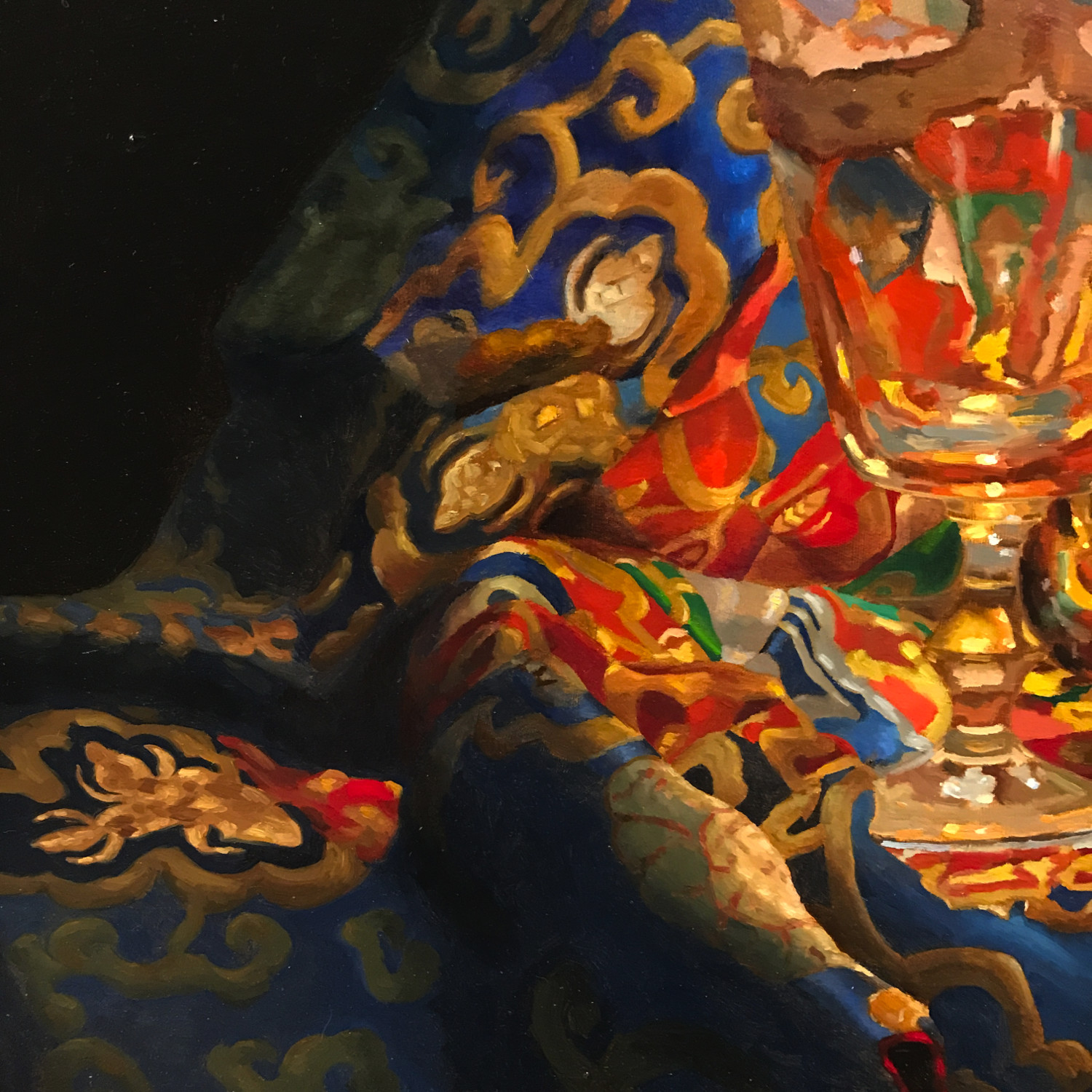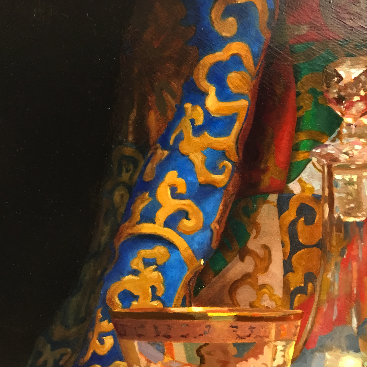 Only the finest quality oil paints were used in the making of this work. The broad fields of blue, red, gold, and green in the Tibetan altar cloth are built from a palette of mineral pigments chosen for their vibrancy and permanence. The gilded accents in the glass are rendered with warm earth colors and transparent tones that echo the richness of the cloth without overwhelming it. The clear passages of glass are shaped through subtle mixtures of cool grays, soft blues, and restrained neutrals, ensuring that each reflection remains luminous and true.