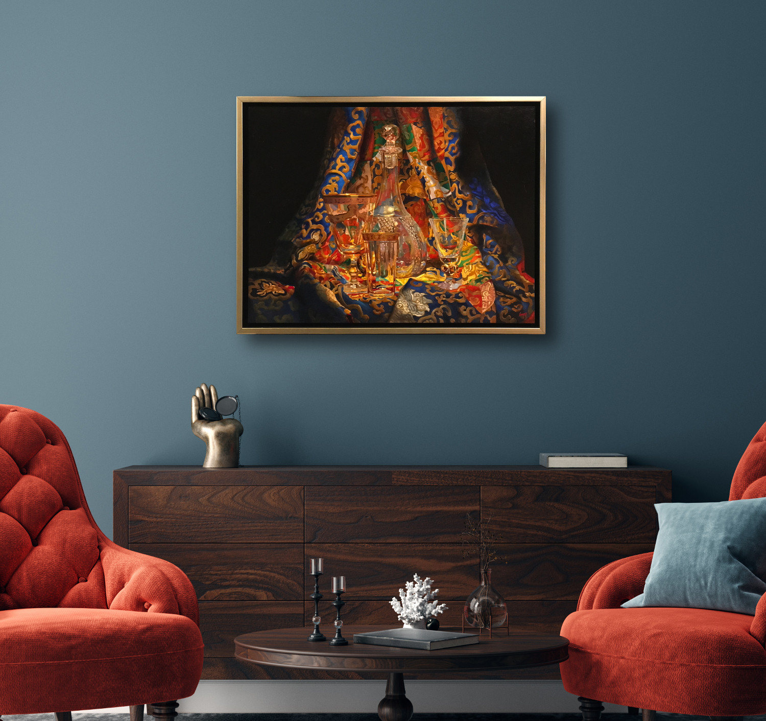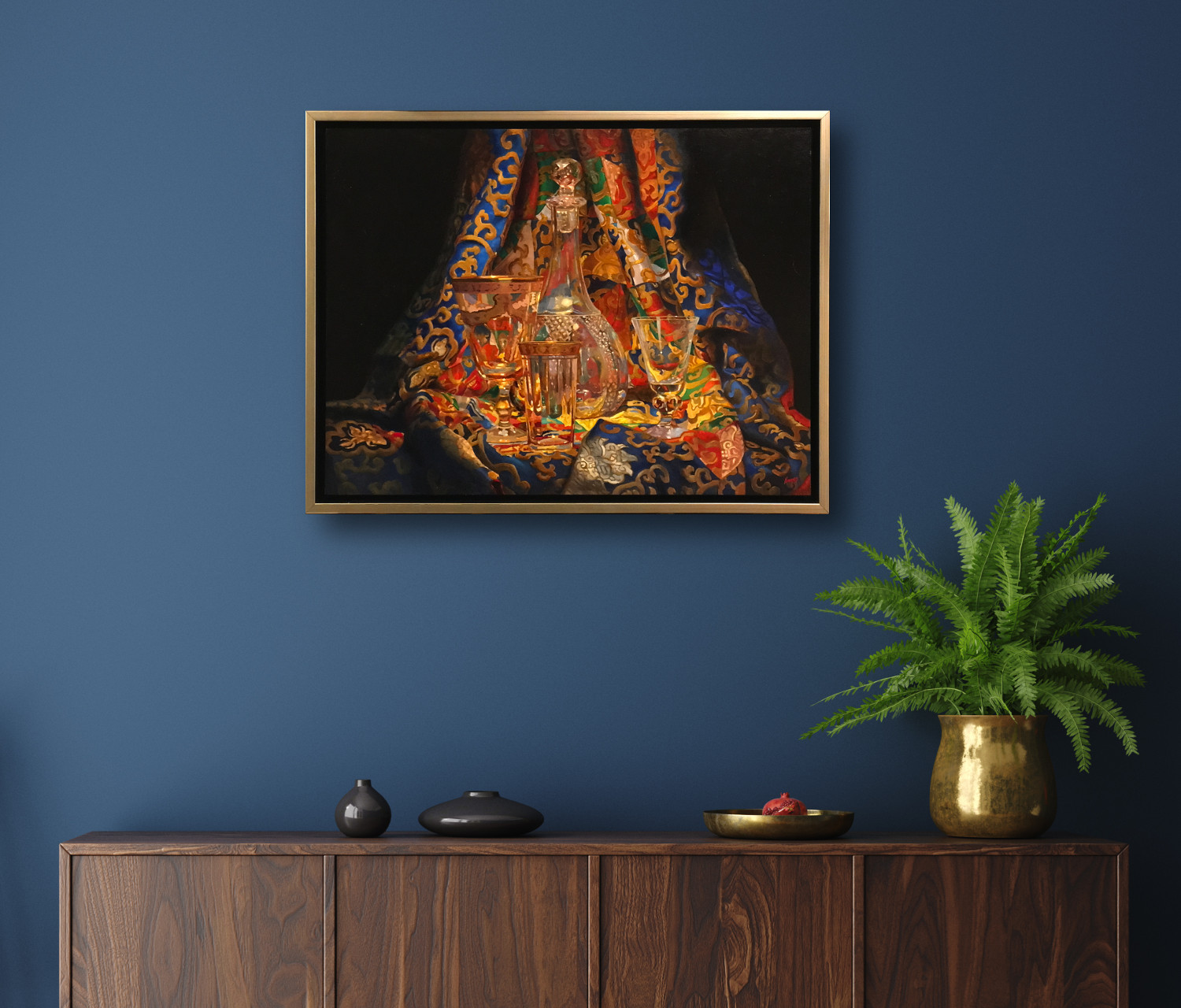 Though intricate in composition, the painting is crafted with deliberate precision. From the glow held within the decanter to the shifting reflections along the gilded glassware, every detail is shaped for both beauty and endurance. This is a work made to last, reflecting not only the objects depicted but the long tradition of fine materials and careful craft behind them.