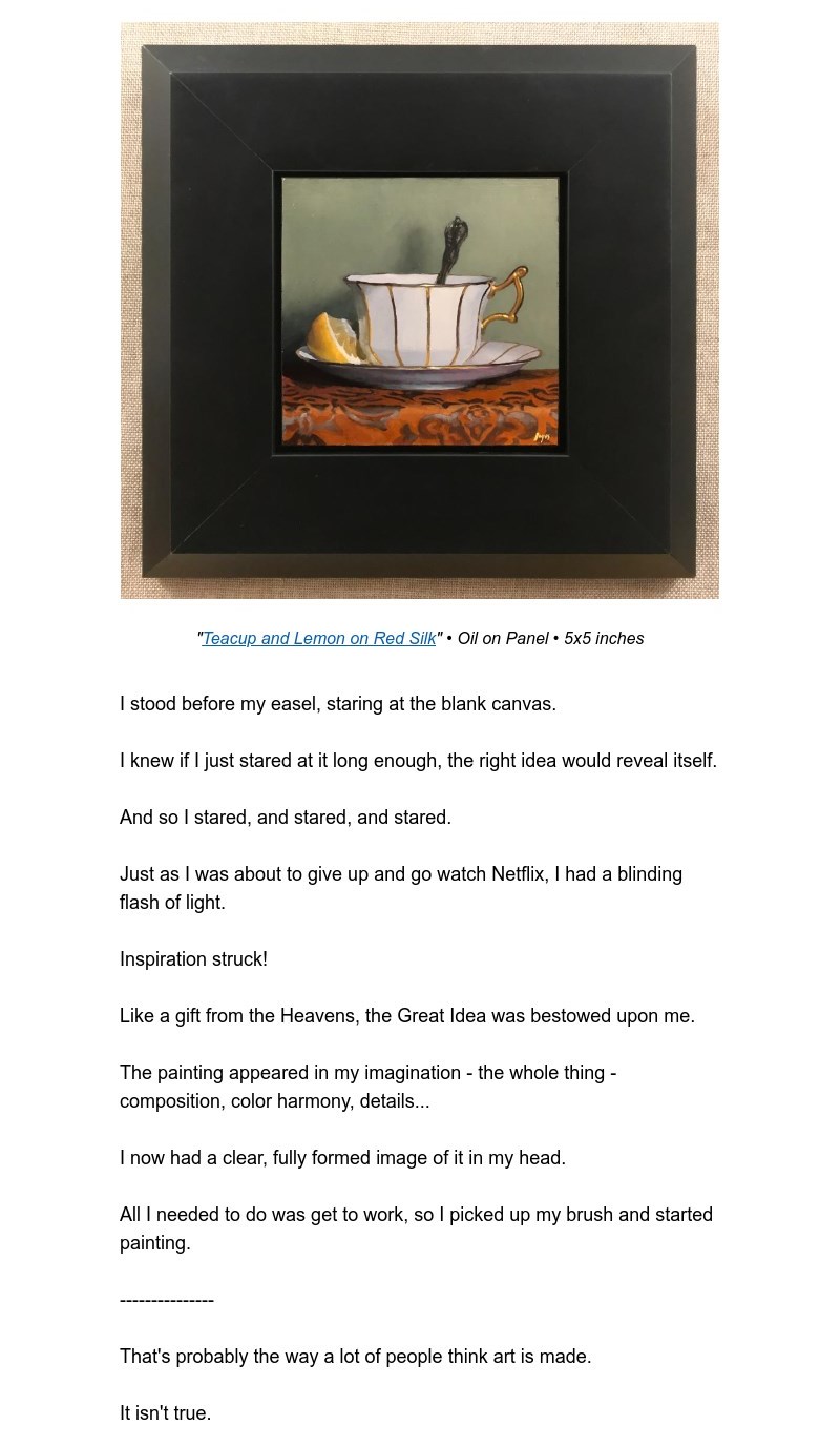 ❧ Read exclusive insights into art and the creative process: Along with each new painting, I share some of my personal thoughts about art – making it, appreciating it, learning more about it. I only share those thoughts with my subscribers.