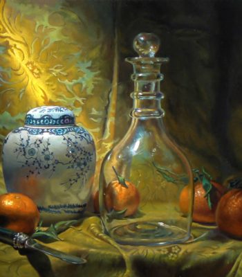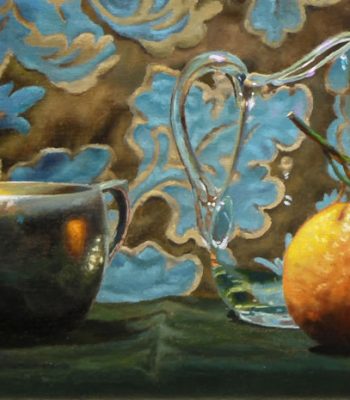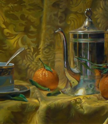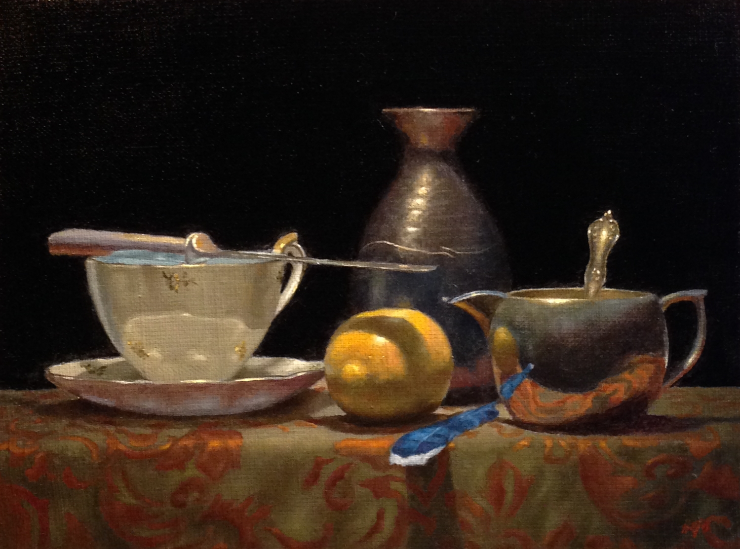 “Tea and Oranges”, oil on panel, 15×24 inches, 2010, Sold